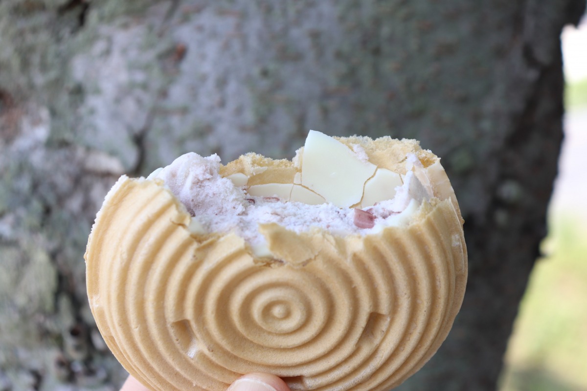 アイスもなかを手で割ると、「バリっ」と音がしました。食べてみると、歯ごたえのある触感の「ばち」がしっかりと存在感を出していました!小豆アイスと「ばち」、合わなそうで、実は相性の良い組み合わせで、癖になりそうな美味しさでした。アイスもなかに「ばち」を入れるアイデアは斬新で美味しいので、流しそうめんの後にはデザートでおすすめです!