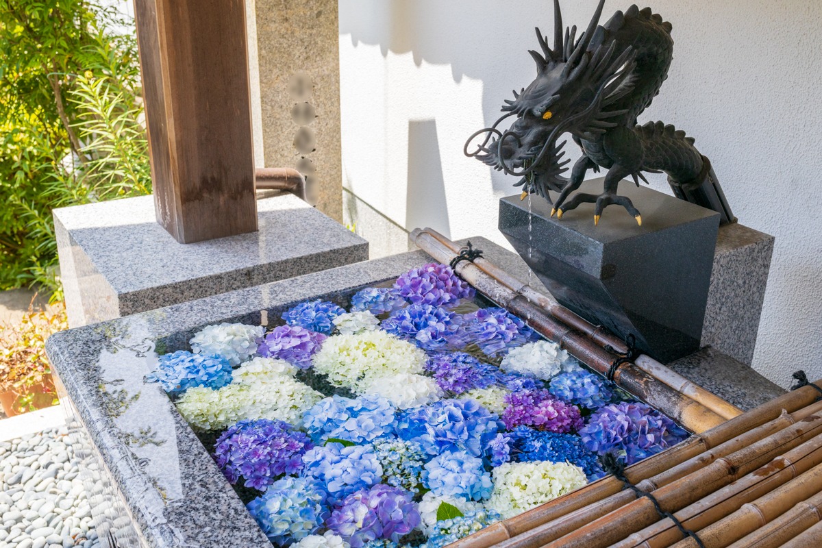 薄紫や水色、白の紫陽花が手水鉢に浮かべられており、心が洗われます。