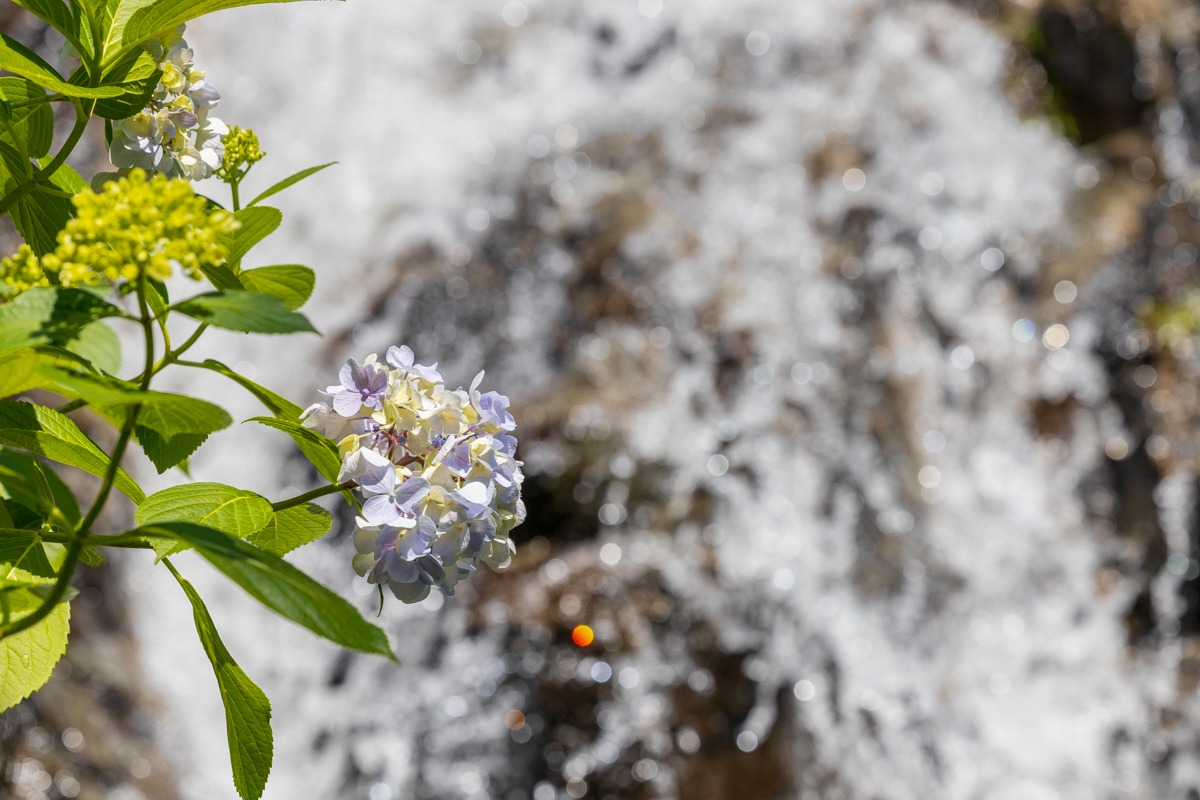 滝の手前にも紫陽花が咲いていて、この時期しか見られない貴重な光景となっています。
