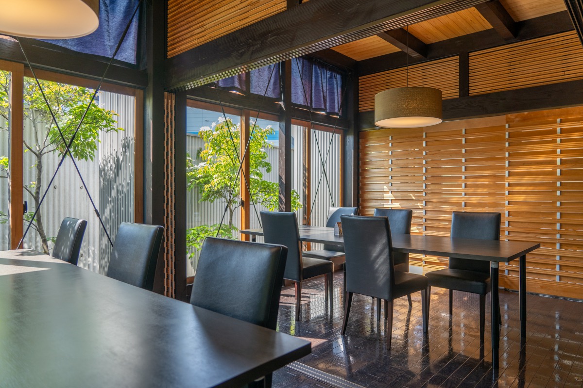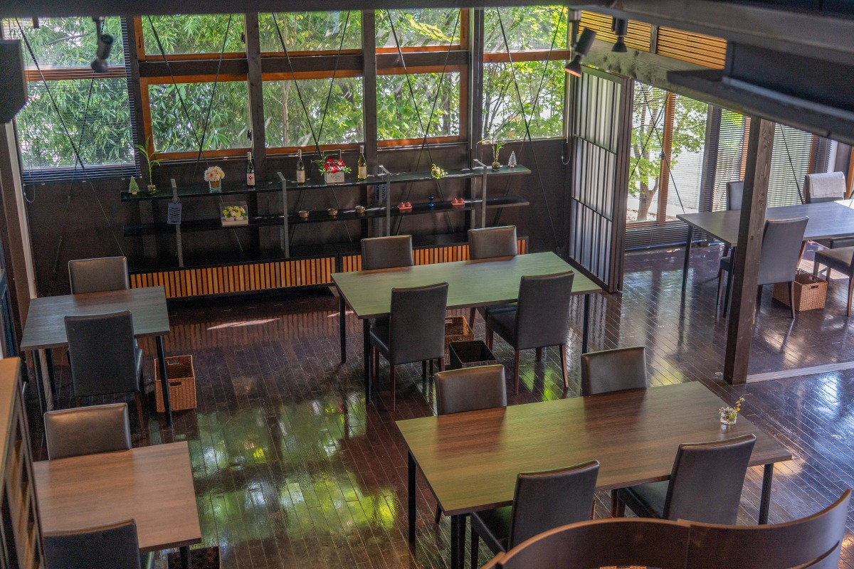 店に入ると雰囲気が一変。モダンでシックな空間が広がります。高い天井、ゆったりと配置されたテーブル席、窓に映る緑。心地よさが溢れる店内は、20人~50人までの貸し切りも可能で、バスツアーの昼食場所として利用されることもあるそうです。ツアーのランチがこんな素敵なお店だったらテンションが上がりそう。