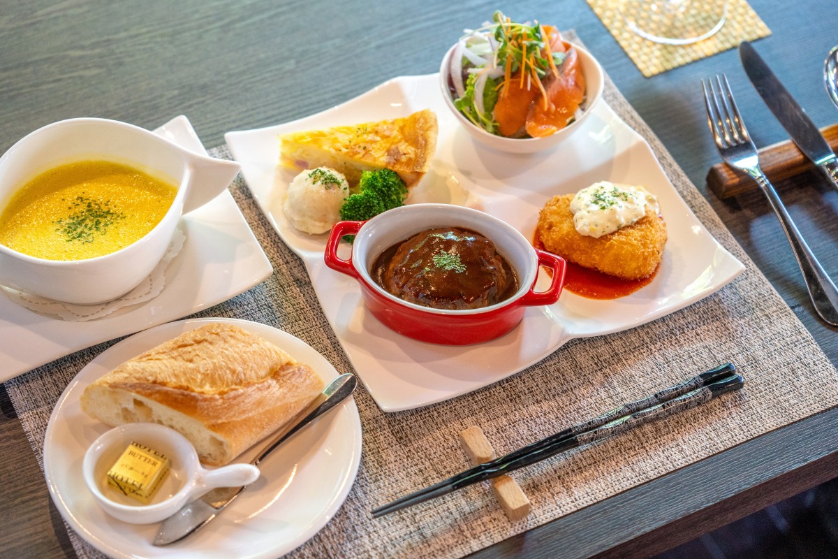 人気は1日限定15食の「日替わり欲張りランチ」(1,580円)。スープ、パンまたはライス付き。この日の献立はサーモンがのったサラダに、デミグラスソースの煮込みハンバーグ、クリームコロッケ、キッシュ。ハンバーグは店の一番人気で、隠し味はなんと砂糖醤油だそう。ごはんにも合う味付けで、年配のお客さんにも好評です。ほかにも、ポークカツレツやチキン南蛮、ビーフ100%のメンチカツ、ズワイ蟹のクリームコロッケなどがメインの終日食べられる洋食セットはどれも1,000円台とお手頃。コース料理も2,800円~!