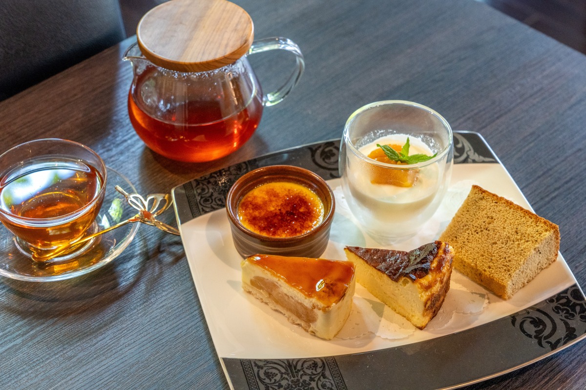 食事メニューだけでなくスイーツも充実しているので、カフェ使いもOKです。自家製のスイーツは毎日約5種類を用意。この日は、りんごのシブースト、チーズケーキ、紅茶のシフォンケーキ、クリームブリュレ、ココナッツのブラマンジェでした。どれも美味しそうで迷います。ランチデザートは350円(ドリンクとセットの場合600円)。
