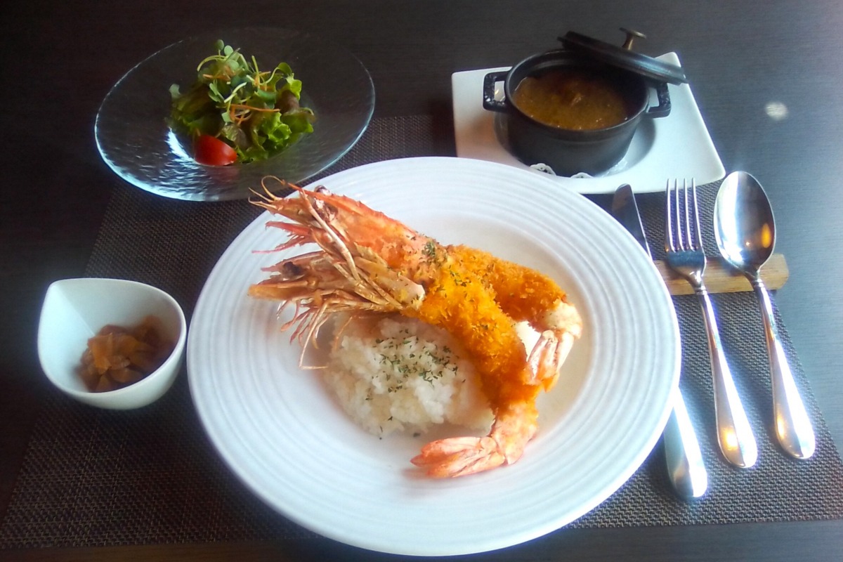 現在開催中の、里庄町内の店舗が自慢のメニューで町を盛り上げるグルメ企画「里庄カレーなんとか」にも参加。「ル・コック・ルージュ」で食べられるのは「欧風カレーと大きなエビフライ」(2,480円)。こだわりのフォンドヴォーに甘く炒めた玉ねぎをたっぷり使ったフレンチスタイルのカレーはコク深い味わい。メニュー名に違わず、贅沢にも大きな有頭海老のフライが2本ものっています。