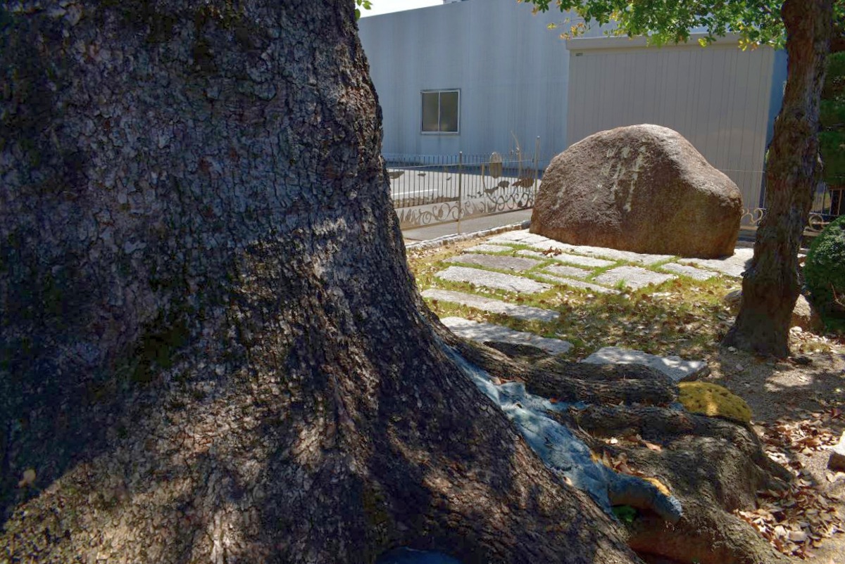 小川に架かる橋をわたった先に生家跡がありました。明治23年にこの地に生まれ、5歳のころに日清戦争がはじまることになります。「心の遠きところ 花静かなる 田園あり」。大きなクスノキの下の石碑に刻まれた譲治の詩は、とても穏やかです。