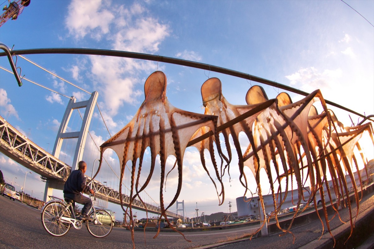 下津井漁港周辺の晩秋から初冬にかけての風物詩的光景です。すぐそばにある下津井大橋(瀬戸大橋のひとつ)と、足を広げて吊るされた大きなマダコが風に揺られる姿が見られます。(11月中旬~12月下旬頃)