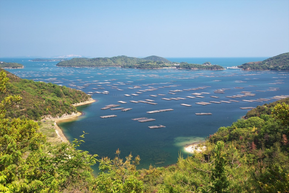 瀬戸内海に面した瀬戸内市邑久町の南東部では牡蠣の生産が盛んです。波の穏やかな虫明湾内には、養殖に使われる筏が多数浮かんでいる姿が見られます。