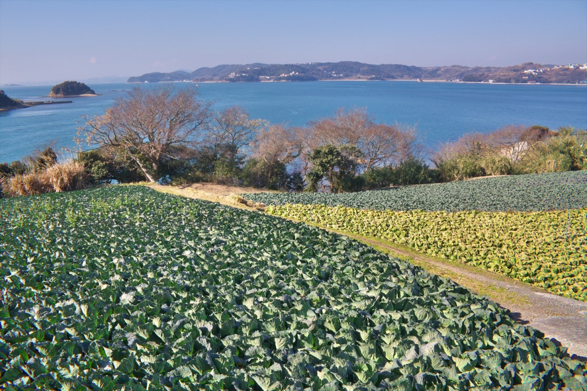 別名「緑島」とも呼ばれる、牛窓の沖合にある周囲約10kmの島の傾斜地を利用した畑では、冬はキャベツ栽培がおこなわれています。瀬戸内海をバックに斜面を埋め尽くす緑のキャベツ畑は壮観です。