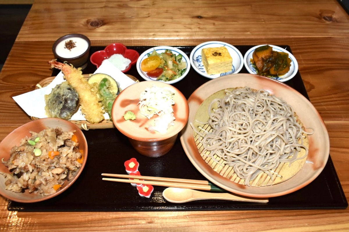 盛りそばに、海老と季節の天ぷらの盛り合わせ、小鉢が3つと、さらに炊き込みご飯とデザートのそば茶プリンがついている豪華版。