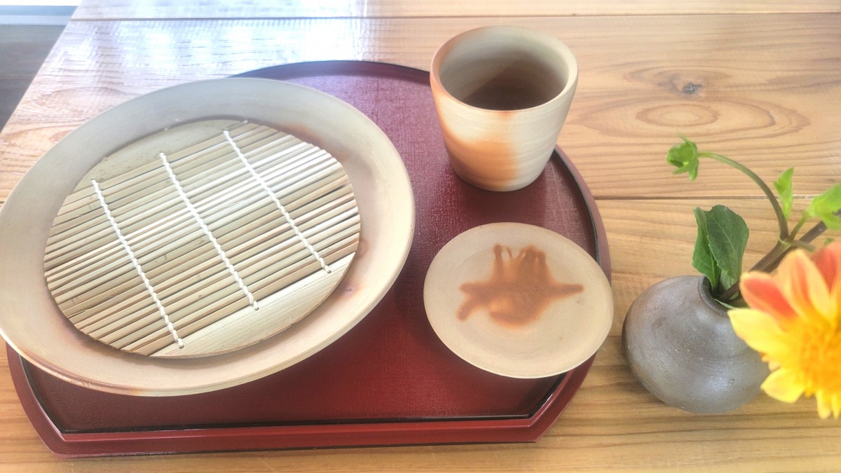 冷たいそば茶と小さな牛乳瓶に入ったそば茶プリン、そばクッキーのセットでテイータイムというのもこの暑い時期には最高ですね。
