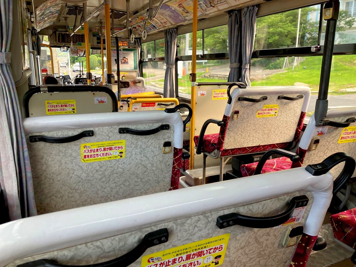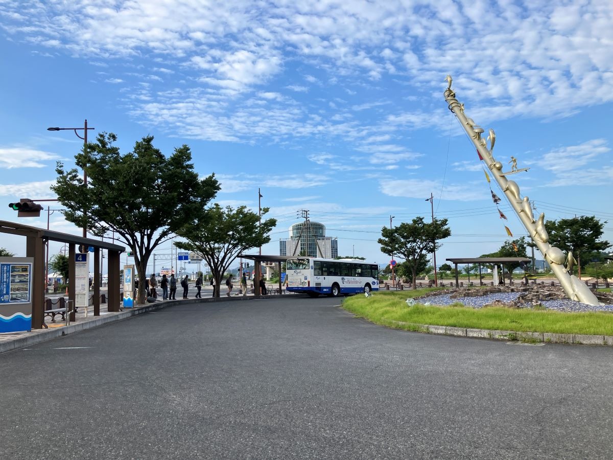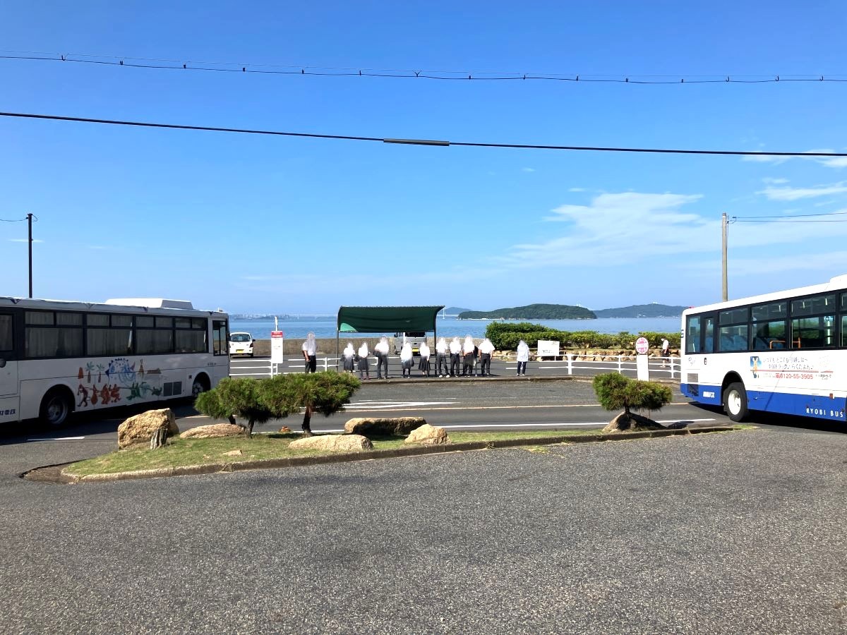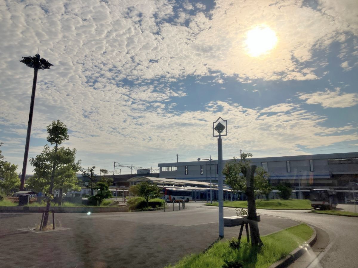 7時40分、JR児島駅。このバス旅の終点です。王子が岳登山口での接続も含め55分ほどの行程でした。平日朝の時間帯ならではの、地元のみなさんの日々の営み。「は~い動くよ~」「いってらっしゃ~い」。運転手さんのやさしい声かけ。ほんとうに美しく、のどかな瀬戸内時間に触れて、あたたかい気持ちになりました。