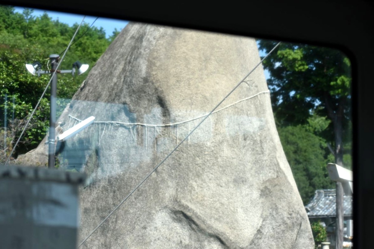 平日の朝6時45分。JR宇野駅を出たバスが玉野隧道をぬけると「つぎは玉比咩神社(たまひめじんじゃ)前~」。進行方向右側の窓を、バスより大きな巨石が覆いつくしています。浦島太郎伝説の乙姫様を祀っている神社の霊岩。玉比咩神社前バス停からも目と鼻の先ですよ。バスは玉地区のレトロな町並みをうねうねと進みます。
