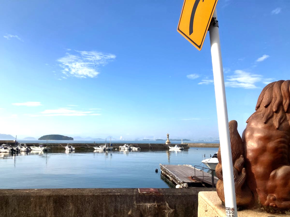7時20分、田の口浜バス停の手前で海も見納め。まばたき禁止です。田の口港をバックにたたずむ備前焼きの狛犬。目線の高いバスから間近に見る姿はなかなかの迫力ですよ。山側にはかつては海の中にあったという大鳥居も。ここは金比羅との両参りで栄えた由加山(由加神社、蓮台寺)への南参道にあたるんだとか。