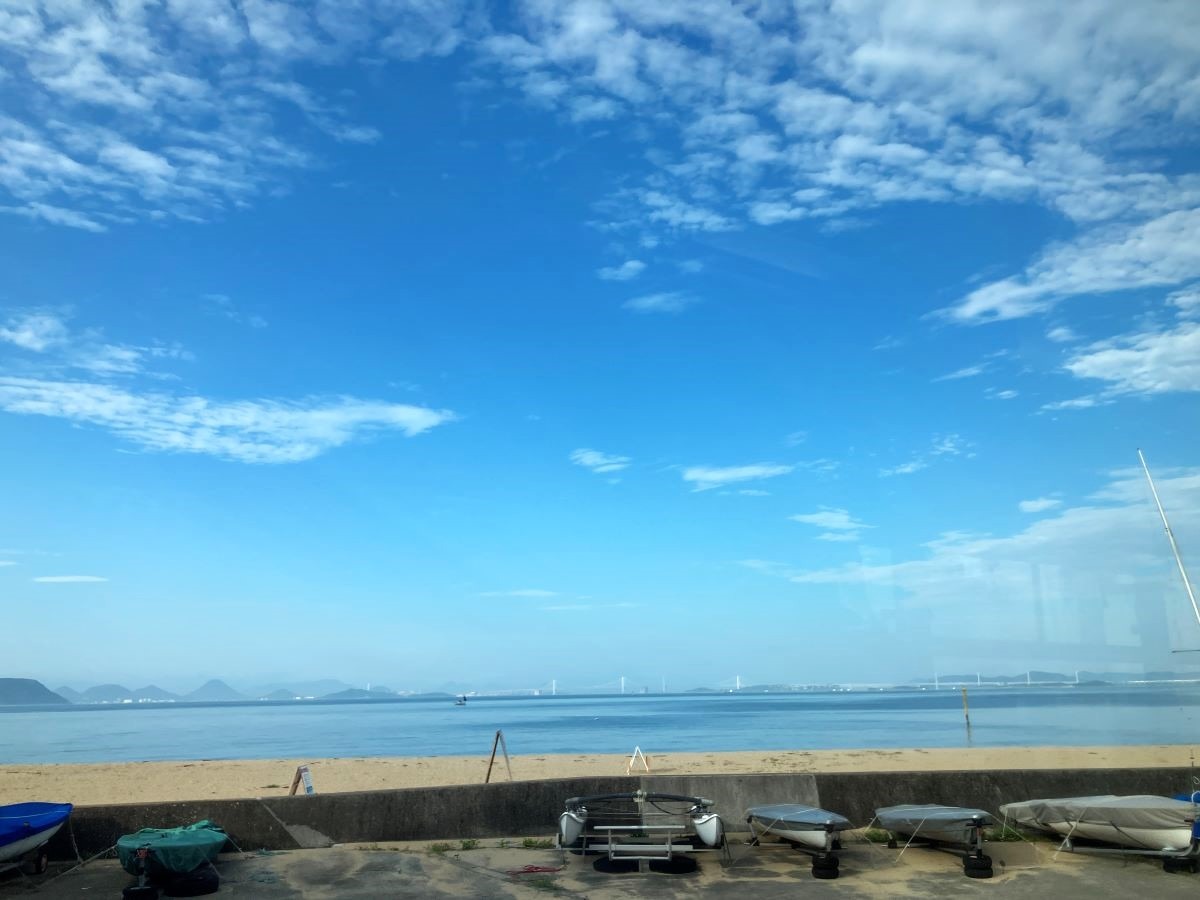 7時5分過ぎ、渋川バス停通過と同時についに瀬戸内海がみえてきました!空も砂浜も広い広い。窓のむこうにこの景色が広がっているなんて。なんと贅沢な路線バスなんでしょう。「渋川マリン水族館」や「マリンホテル」など、海をたのしみ尽くせるスポットがあつまっています。