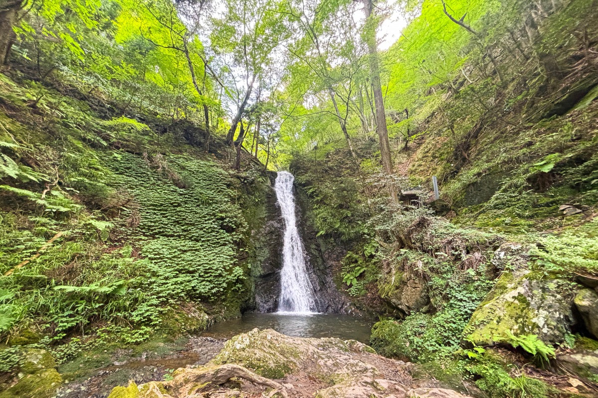 黒木キャンプ場近くの脇道を入ると駐車場があり、駐車場から整備された山道を約5分歩くと滝が見えてきます。滝に至るまでの短い山歩きが気持ち良いです。