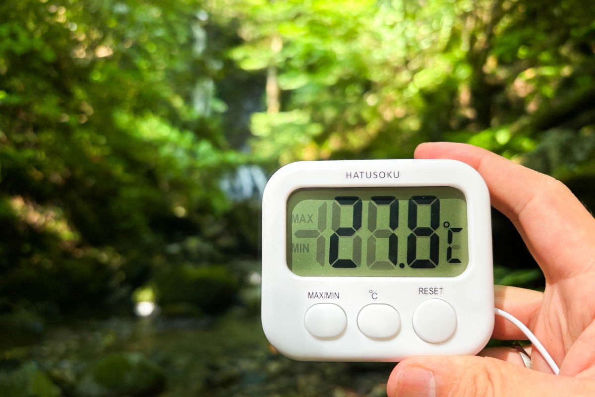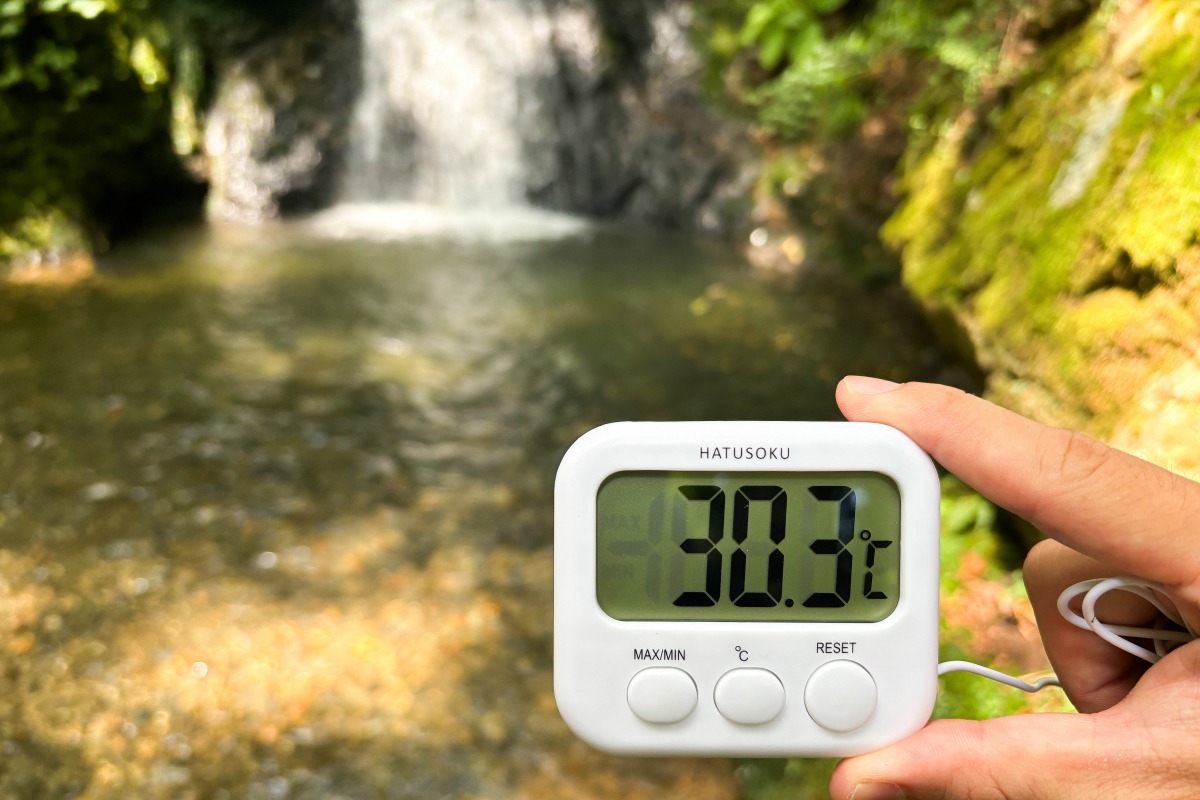 滝の周辺の気温と水温を実際に測定して、市街地と比べてどれくらい涼しいのかも調べてみました。