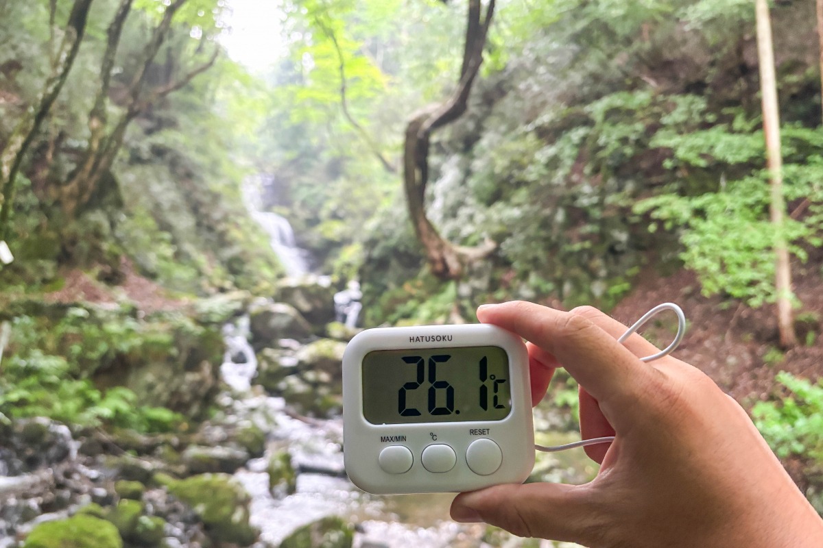今回の計測では、デジタル温度計に加えて棒温度計も使用しました。棒温度計ではデジタル温度計よりも2〜3度低く計測されていたので、記事内の気温の数値以上に現地ではさらに涼しく感じられるかもしれません。「滝が涼しいのではなく、単に標高が高いから、または森の中だから涼しいのではないか」と思う方もいるかもしれません。そういった要因も影響していると思いますが、滝の周りが街中と比べると涼しいということは事実だと分かりました。
