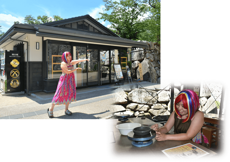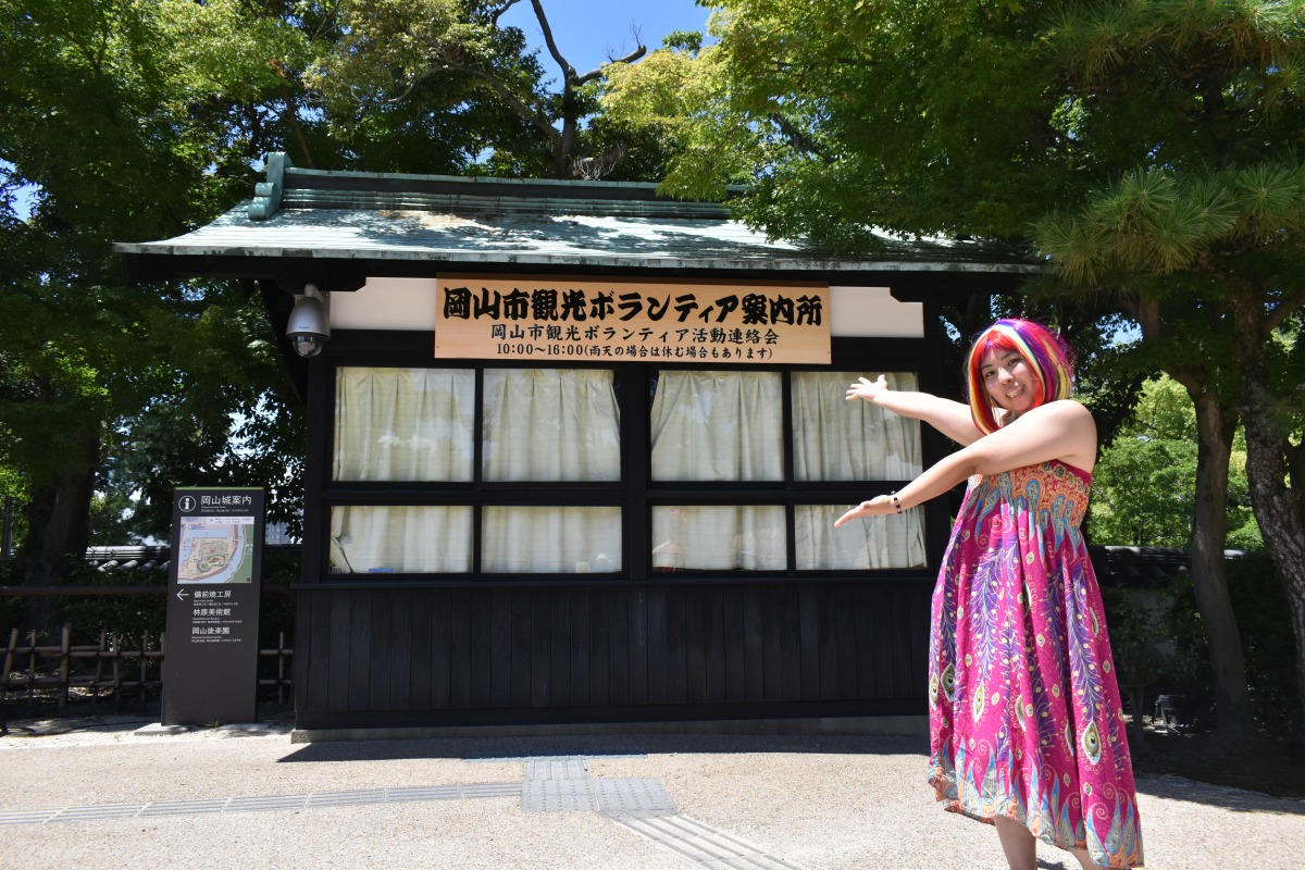 岡山城天守のすぐ隣に岡山市観光ボランティア案内所がある。岡山市観光ボランティア活動連絡会(おかやまももたろうガイド)の黄緑色の帽子と上着を着たボランティアガイドの方々がおり、岡山城を無料でガイドしてくださるんじゃ。おもしろ楽しくスムーズに岡山城を観光できるじゃろう!