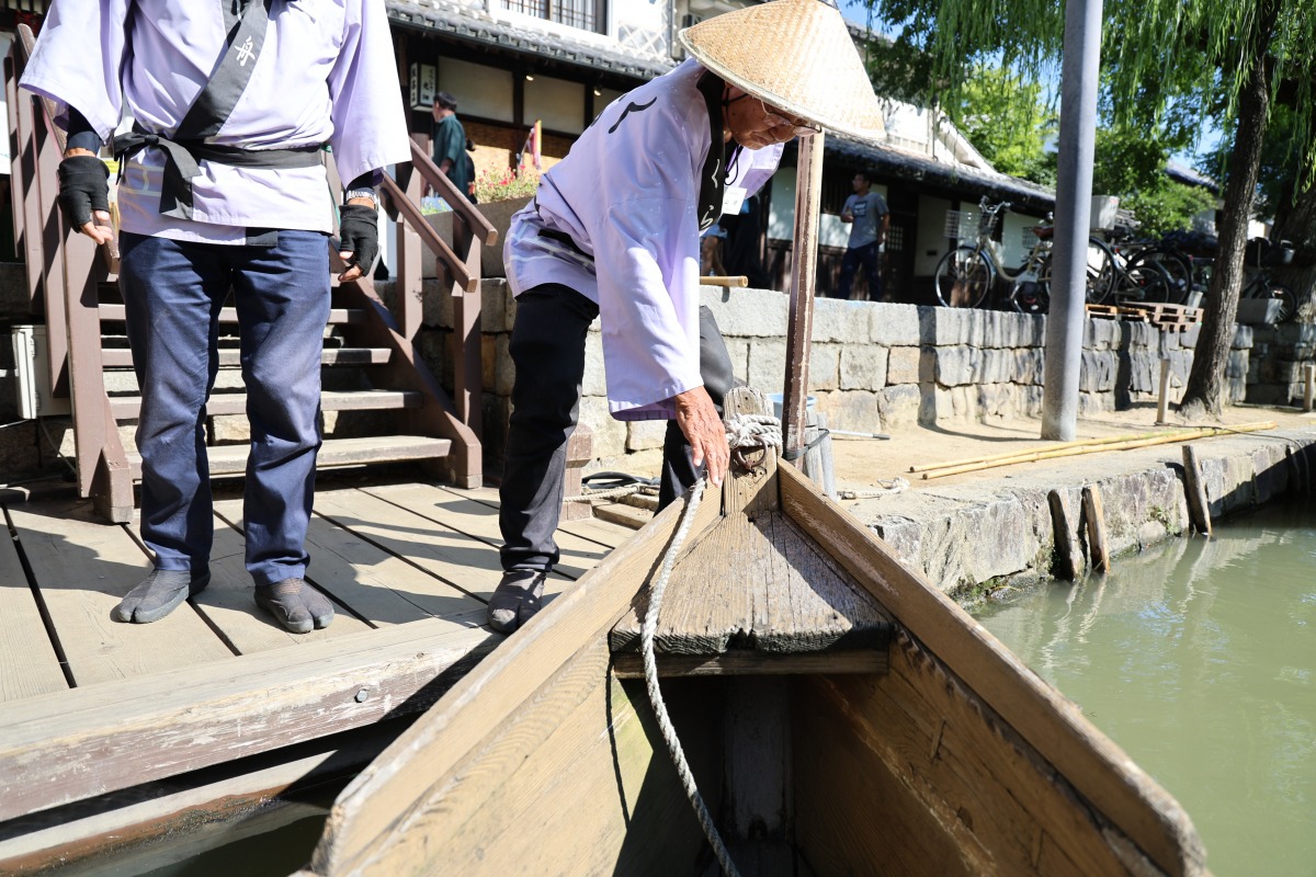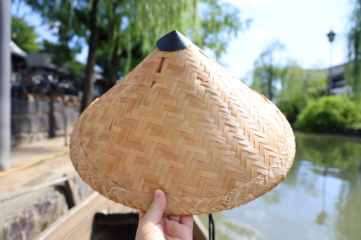 もう一度中橋をくぐり、乗船場所に戻ってきました。約20分間の船旅でしたが、暑い日でも笠のおかげと、水面に近いせいか心地よかったです。「くらしき川舟流し」、初めて乗りましたがこれはおすすめです!