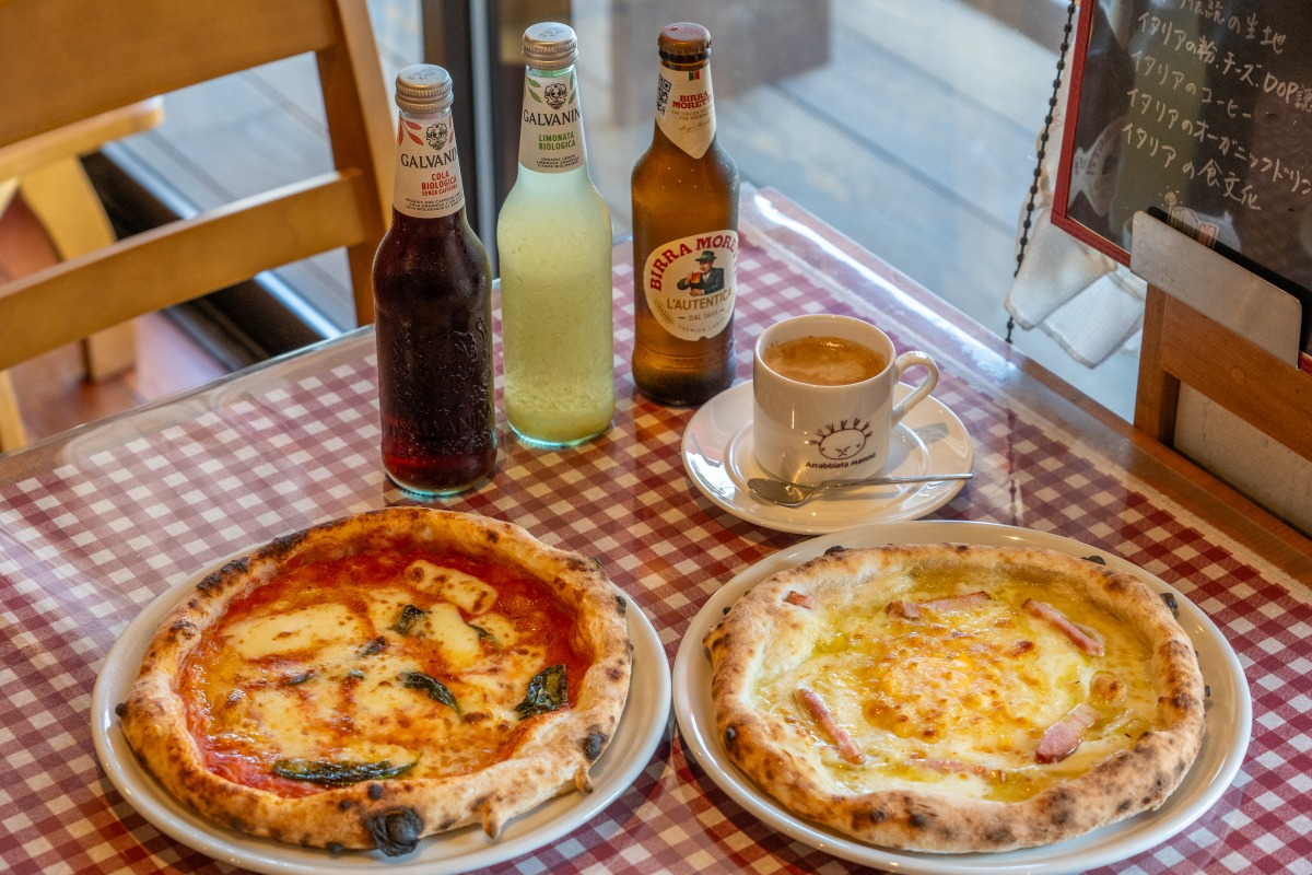 吉備中央町 加茂川庁舎のすぐ近くにある「アラビアータ・マンマ」はナポリピッツァ専門店。本場イタリア産の食材で作るピッツァが味わえます。ナポリピッツァの代表ともいえるマルゲリータをはじめ、唐辛子オイルの効いたピッツァ・アラビアータ、4種のチーズが楽しめるクアトロ・フォルマッジなど、8種類のレギュラーメニューに加え、季節やイベントにあわせて登場するものもあるそう。写真は「マルゲリータ(1,540円)」と、生クリームに玉ねぎ、ベーコン、卵にモッツァレラチーズがのった「モンテビアンコ(1,760円)」。コーヒーをはじめ、リモナータやビオコーラ、ビールもイタリア産です。
