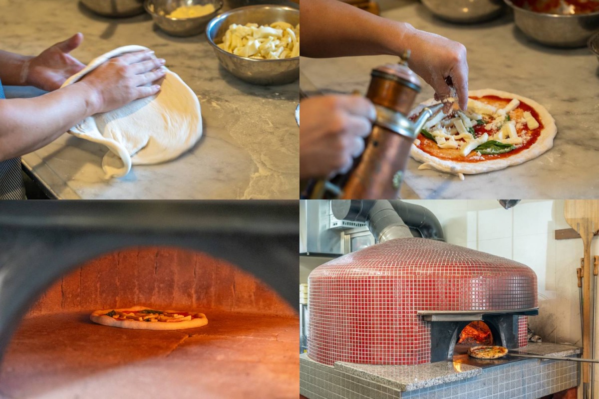 イタリア産の粉を使った生地は、気温や湿度など季節によって状態を見極めながら自家発酵させたもの。注文を受けてから職人が手で延ばし、ソースの上に具材をトッピング、オリーブオイルをかけて窯の中へ。短時間高温で焼かれた、ふっくら芳ばしい生地にとろけるチーズ! あっという間に美味しそうなピッツァができ上がります。