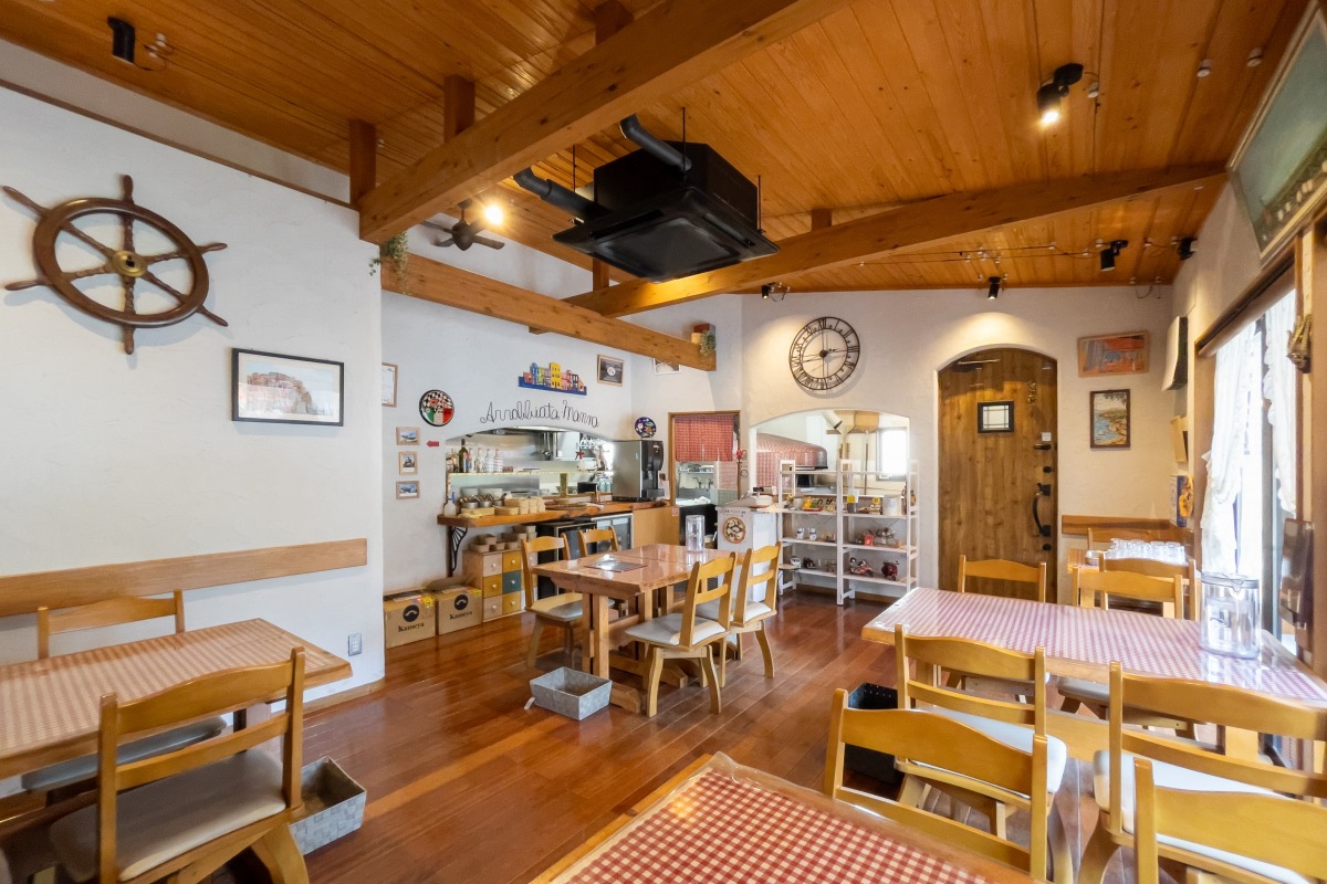 板張りの床や天井に、手塗りの壁、落ち着いた色合いの照明が灯された店内は、ほとんど全ての席から厨房の窯が望めます。手作りのオブジェやイタリアを感じさせる絵なども壁に飾られ、あたたかな雰囲気の中で食事が楽しめます。