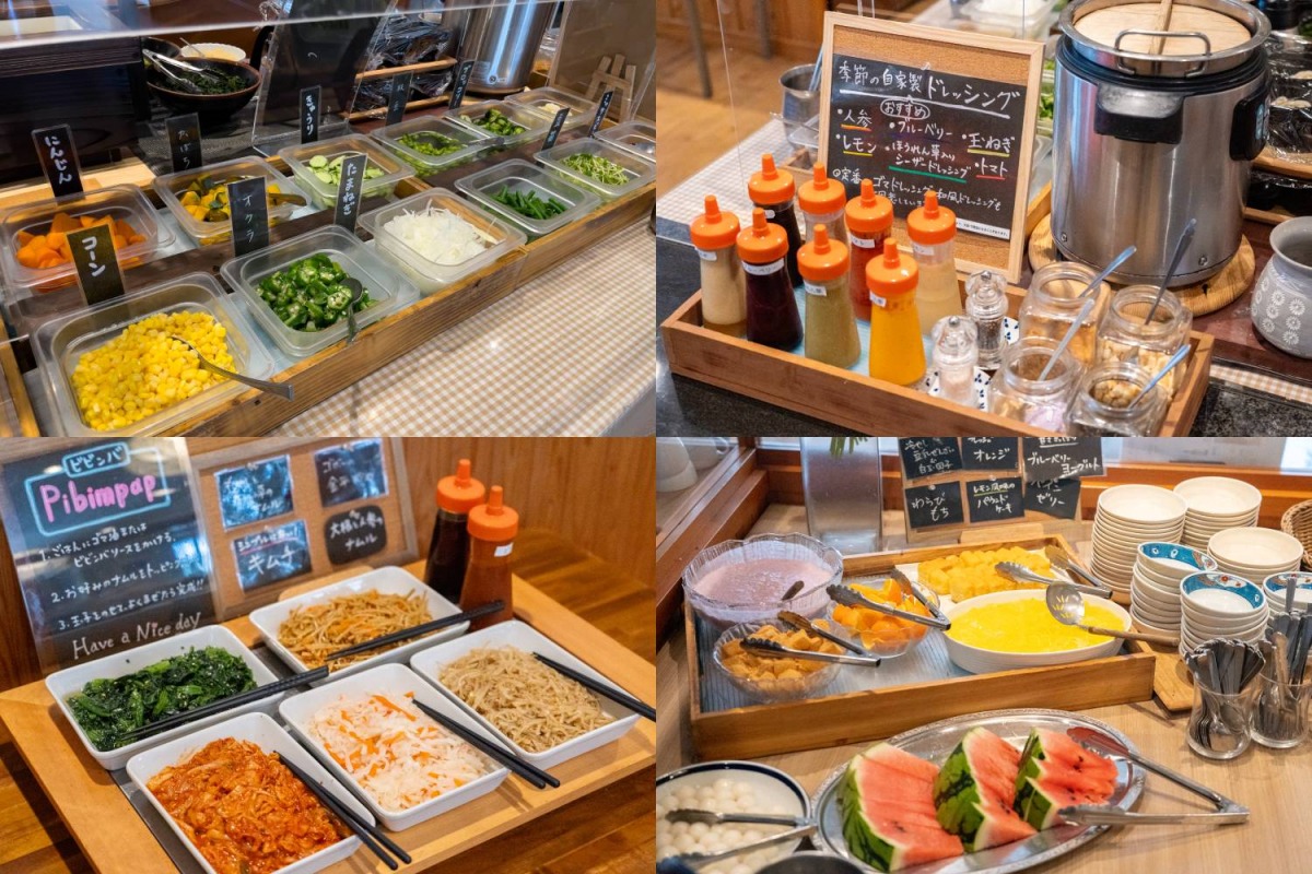 サラダコーナーには、和風やゴマといった定番に、レモンやトマト、ほうれん草入りシーザードレッシングなど季節ものを含めた全8種類の自家製ドレッシングが。さらに、好みのナムルやキムチをトッピングして自分だけのオリジナルが作れるピビンバコーナー。ゼリーや焼菓子、わらびもちや豆乳ぜんざい、季節のくだものが並ぶデザートコーナーなど、メインの料理以外にも、食べたいもの気になるものが多くて迷います。