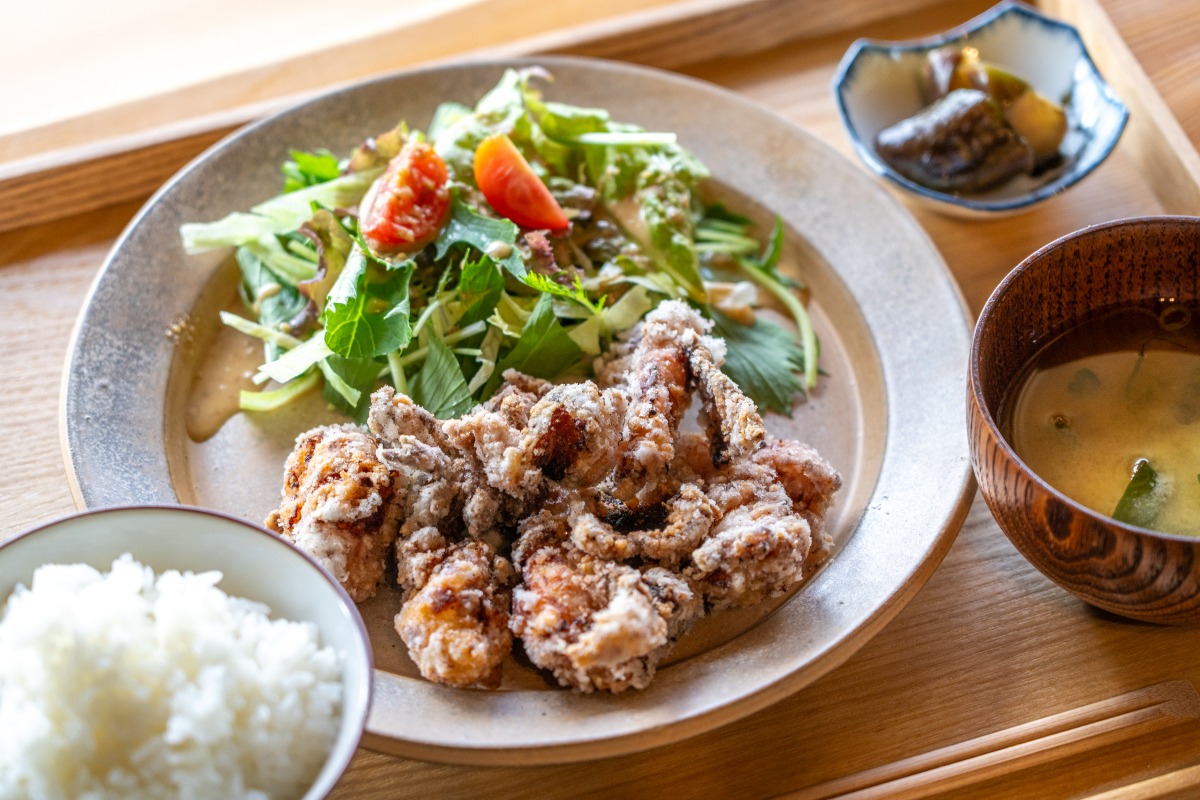 「道の駅 かもがわ円城」から車で約5分。棚田を見渡す場所にある古民家カフェのランチは常時3種類ほどが用意され、どれも1,100円(平日はドリンク付き)。定番人気は「吉備高原どりの塩麹からあげ」。塩麹に漬け込まれた鶏肉はしっかりと味が沁み込んでいてジューシーです。お米は円城産、味噌は手作り。ほかにも猪肉のコロッケや吉備中央町産のキャベツのメンチカツ、春には筍のガパオライスなど、地元の旬の食材がふんだんに取り入れられたランチが楽しめます。