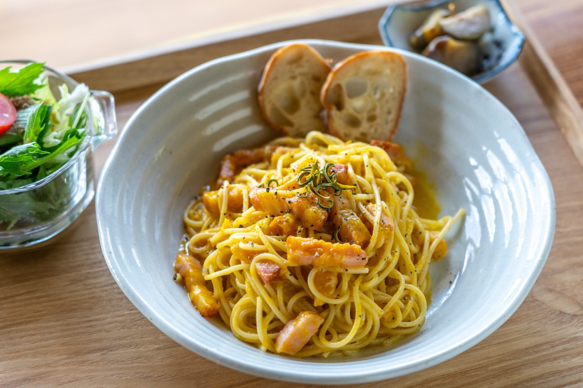 不定期で登場するというパスタ。この日はかぼちゃのクリームパスタでした。運ばれてきた瞬間に鼻をくすぐるガーリックの香り。まろやかな甘さの吉備中央町産のかぼちゃクリームと厚切りベーコン、カルボナーラのような濃厚さにハマります。