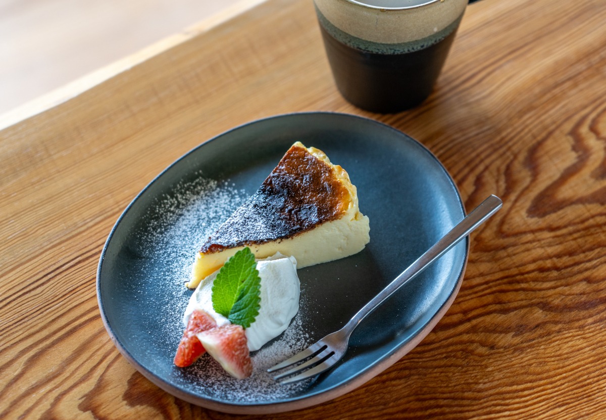 自家製のスイーツもおすすめ。「ラム酒香るバスク風チーズケーキ(500円)」のほか、ガトーショコラや季節のタルト、パフェなどメニュー豊富です。食後に追加オーダーして、カフェタイムを楽しむ人も多いそう。また、自家栽培の黒豆きなこ、無農薬オレンジなどを使ったパウンドケーキやクッキーも人気で、購入のみもOKです。※ドリンク、焼菓子はテイクアウト可。