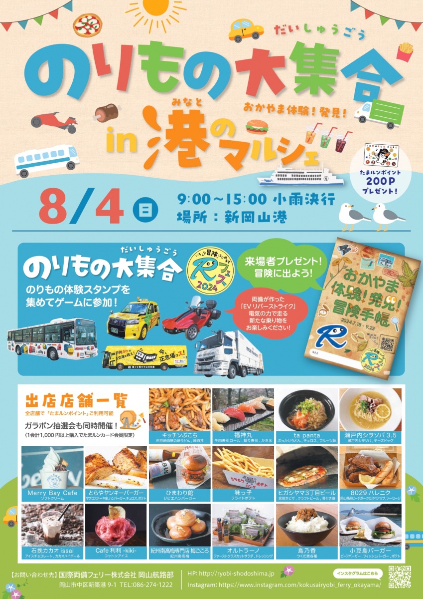 岡山市の新岡山港で開催されている「港のマルシェ」。大人気のイベントでこれまで7回開催されています。今回は2024年8月4日(日)のマルシェに実際に行ってきた様子をご紹介。この日は「のりもの大集合 in 港のマルシェ」と題された、いつものマルシェとは少し違った様子でした。