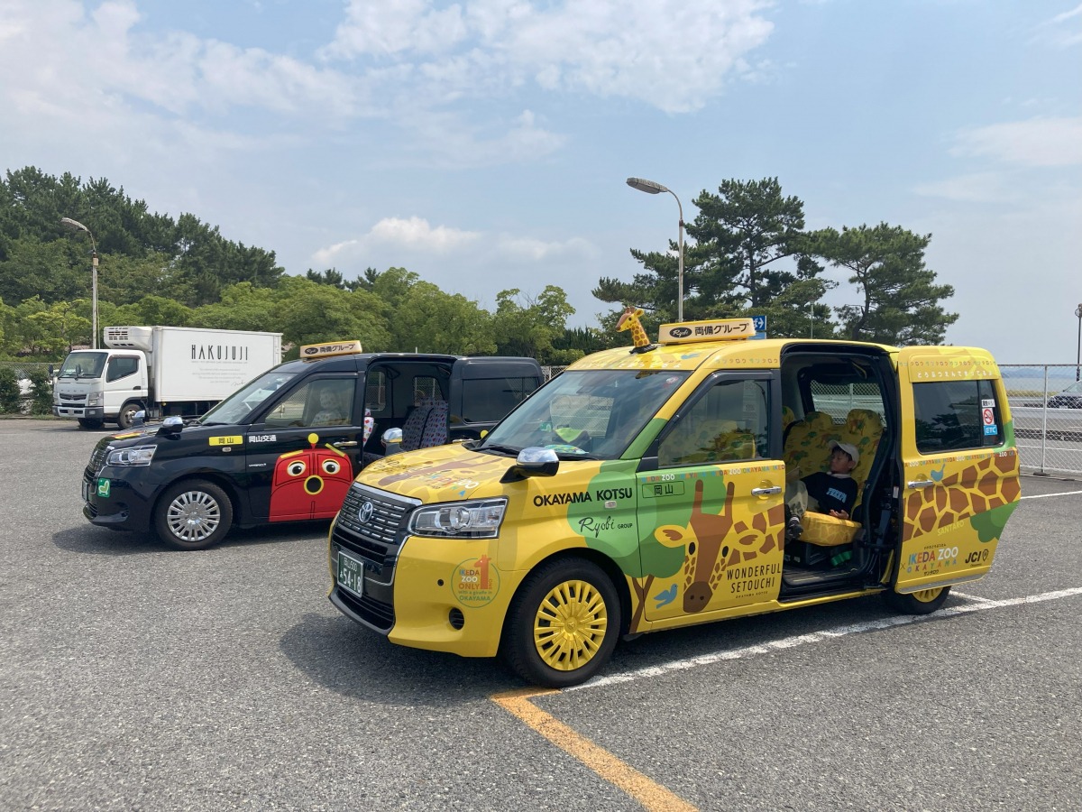 「のりもの大集合」最後の展示はタクシー。手前のタクシーは、岡山市にある「池田動物園」のキリンのサンタロウがモチーフになっています。県内に1台しかないタクシーなので見られたらラッキーです。