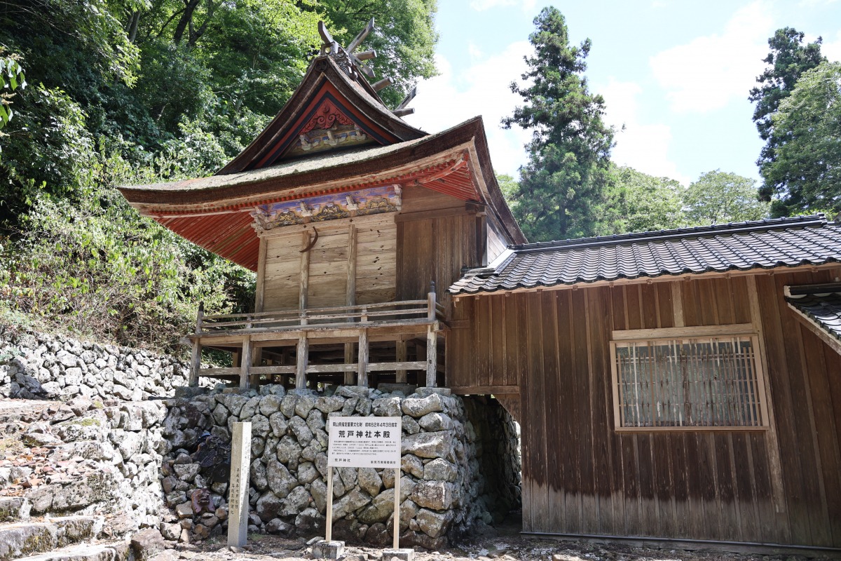 岡山市から一般道で約2時間。国道180号線を高梁川沿いに北上し、新見市哲多町の新見川上線を走ります。ここまではとても広い走りやすい道ですが、最後の山道はすれ違いが難しい山道になります。秘境という言葉がぴったりの山道をドキドキしながら抜けると、「荒戸神社」に到着です!秘境にあるとは思えない、手入れの行き届いた落ち着きのある佇まいです。