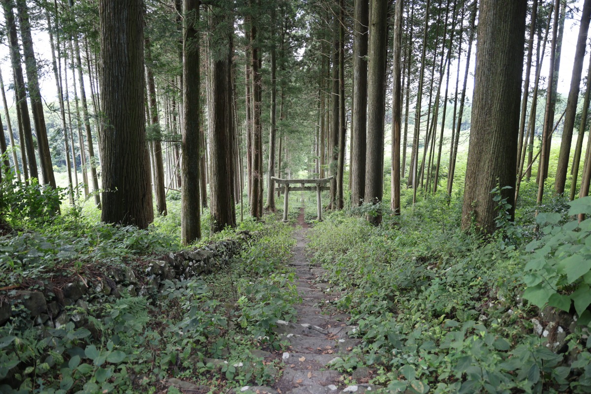 山門から鳥居を目指して参道を歩いてみました。大木の杉並木は圧巻の姿で、山を吹く風はかなり涼しく(この日は猛暑日でしたがかなり涼しく感じました)、コオロギやウグイスなど、森の小さな生き物たちの鳴き声が聞こえてきます。山門から下る参道はなだらかな勾配があります。平坦な参道をイメージしていたので、坂道だったのは意外でした。