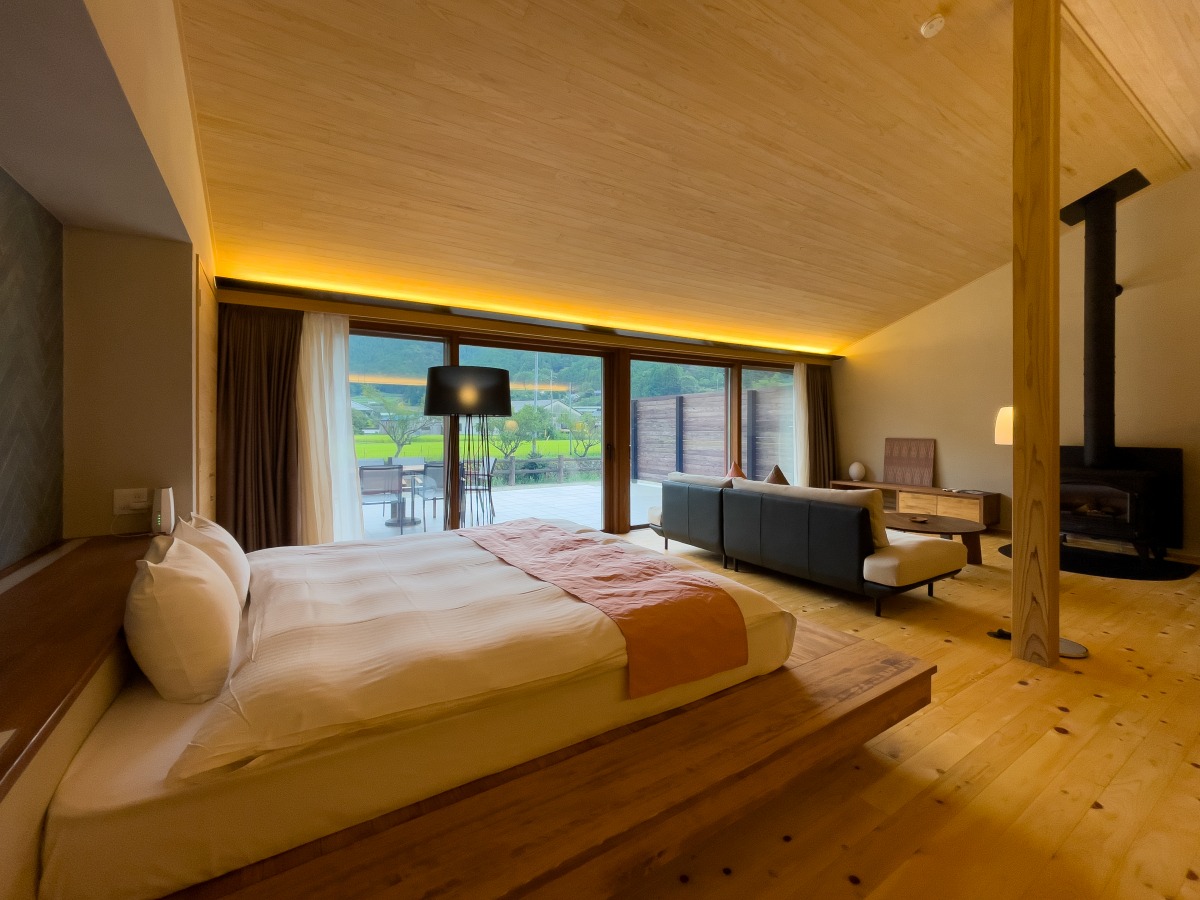 薪ストーブのあるリビングと、キングサイズのベッドが置かれたスペースはひと続き。木の温もりが感じられる、開放感ある上質な空間です。大きな窓の外に配された広いテラスでも特別なひとときが楽しめそう。