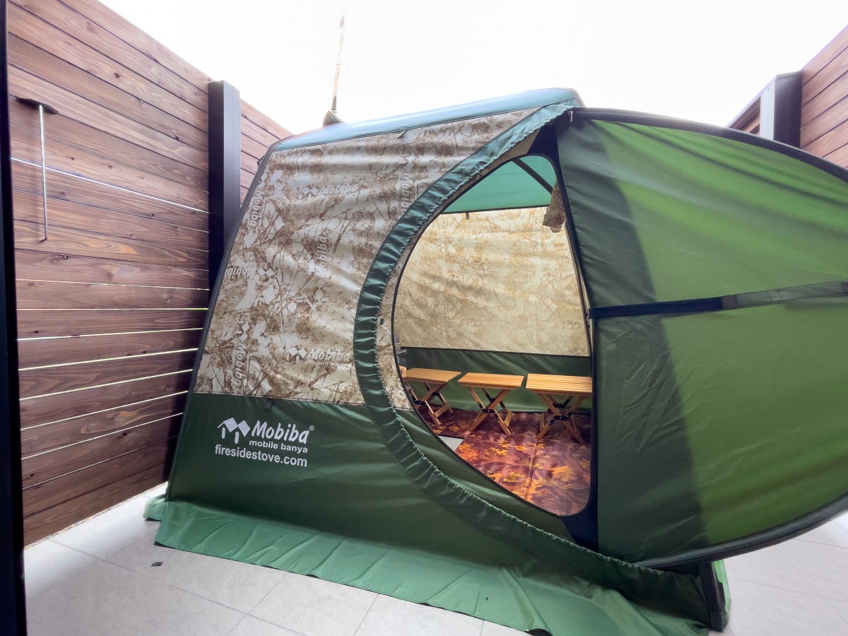 バスルームから続くテラスにはテントサウナも設置されています。テラスの向こうには塩谷川が流れているので、夏場には火照った身体を川でクールダウンも。