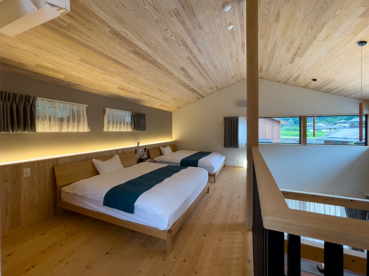 寝室は2階にあります。クイーンベッドが2台。高い位置の窓から静かな村の景色や、星空を眺めながら眠りにつくのも素敵です。
