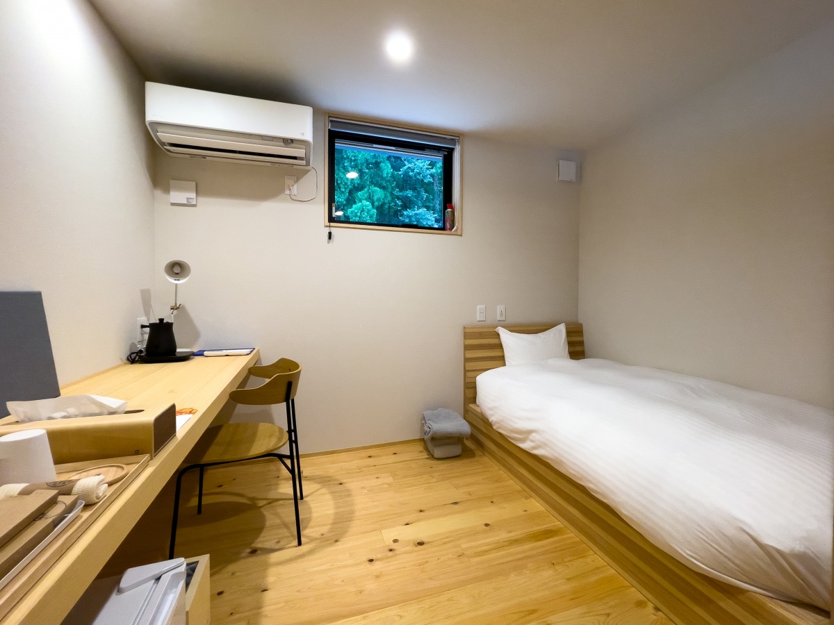 シンプルだけど居心地の良いシングルルームでは、落ち着いたひとり時間を満喫。トイレ、バス、シャワーは共用になっています。