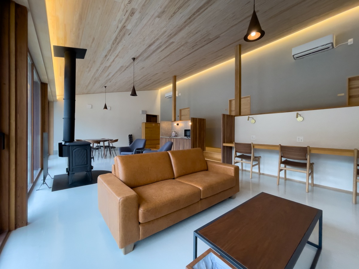 大きな窓から中庭が望める「山吹」の共用スペース。薪ストーブを中央に、椅子やソファー、テーブルなどがゆとりを持って配置されており、ワーキングスペースとしても快適な空間。簡易キッチンもあるので、飲食しながら宿泊者同士が交流を楽しむ場にもなります。