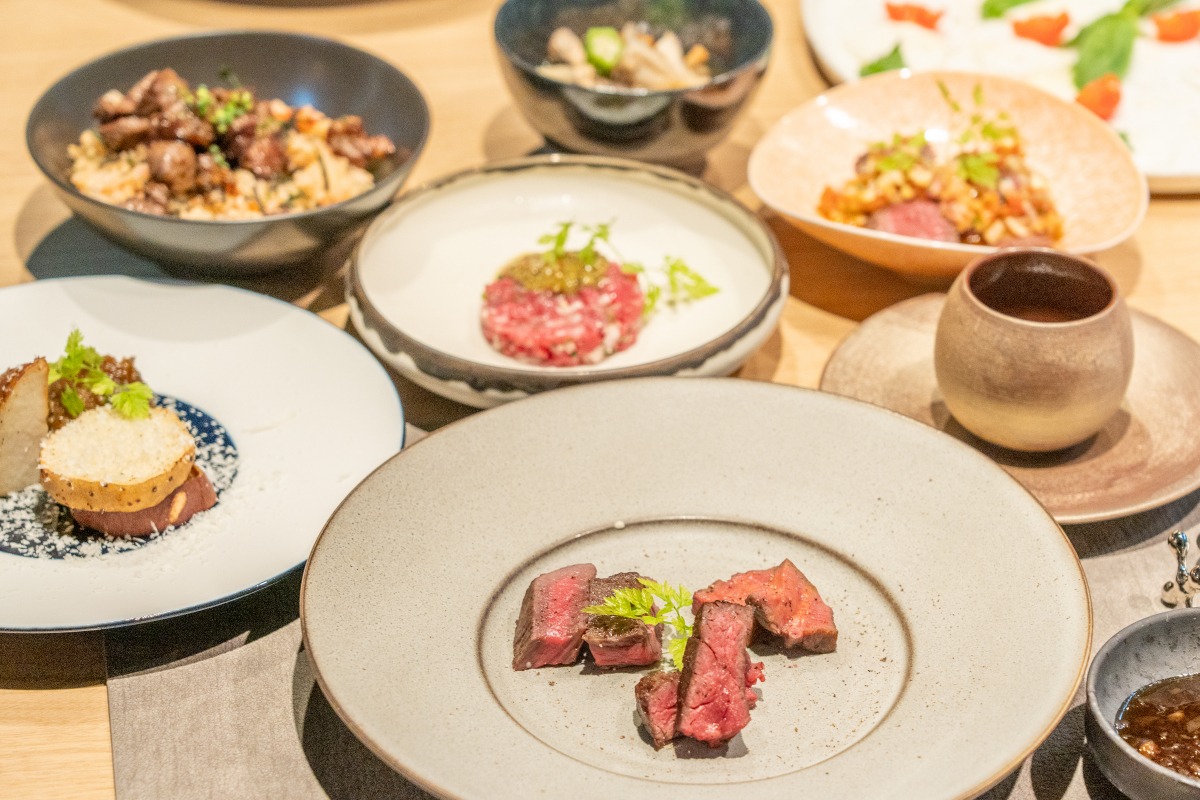 ディナーのスペシャリテは「森の雫コース」。ミシュランガイド1つ星を獲得したフランス料理店「meli melo(メリメロ)」の、佐藤大典シェフ監修の料理が堪能できます。あわくら牛ステーキ、あわくら牛めし、牛肉タルタル、牛肉の冷製フルーツサラダ仕立てなど、地元産の牛肉づくし。