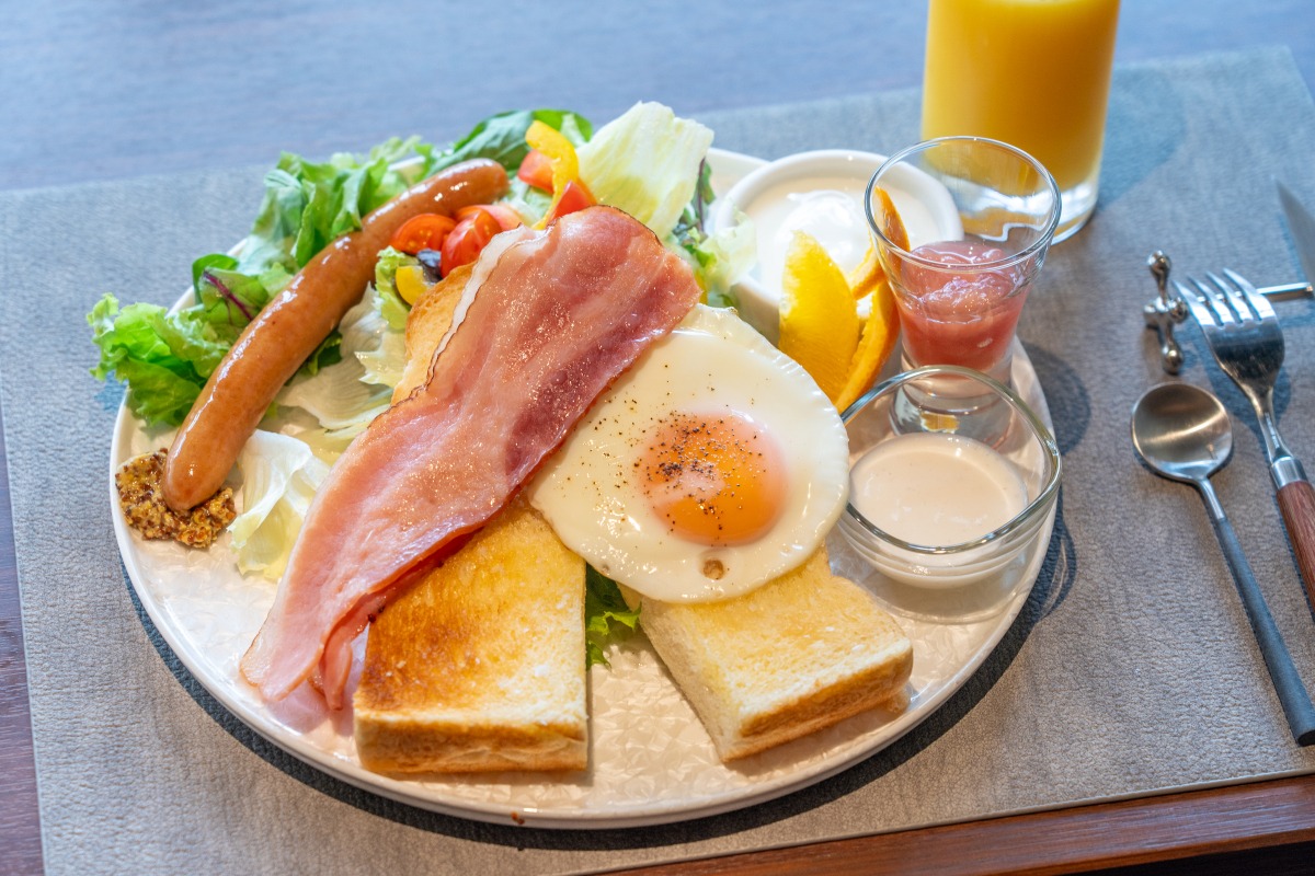 ワンプレートにサラダ、トースト、目玉焼き、ソーセージ、ベーコンなどが盛られた朝食。ヨーグルトにはホテルで手作りしている自家製ジャムが添えられています。