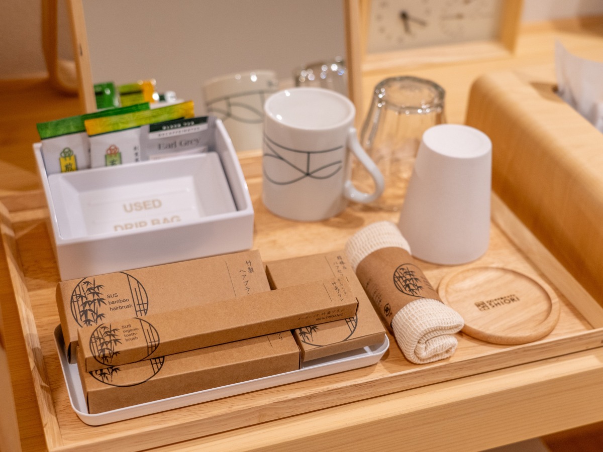 アメニティやカトラリーも充実。ティーバッグのお茶や紅茶のほか、珈琲豆と一緒にミルやコーヒードリッパーも用意されているので、挽きたて淹れたてを楽しめます。また冷蔵庫には数種類のアルコールのほか、ノンアルコールドリンクも用意。こちらはすべて宿泊料金に含まれているので、気兼ねなく楽しめます。