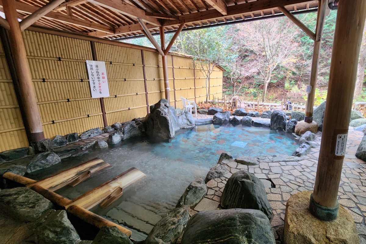 「100年の森のホテル 栞」から車で約2分の日帰り温泉施設「湯~とぴあ 黄金泉」。ホテルの宿泊者は部屋のカードキーを持参すれば、無料で利用できます。ホタルや紅葉、雪景色が見られる露天風呂のほか、薬湯やサウナもあります。