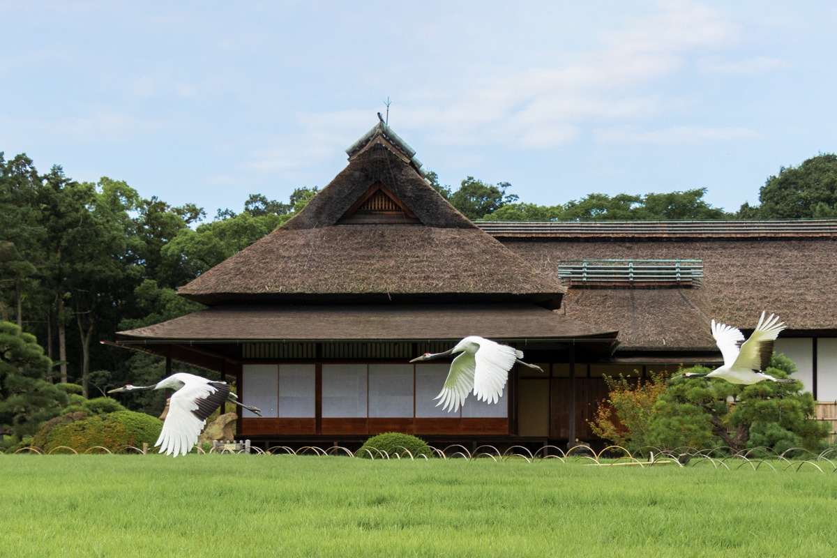 かつて藩主の居間として使われていた延養亭(えんようてい)の前を優雅に飛んでいきます。