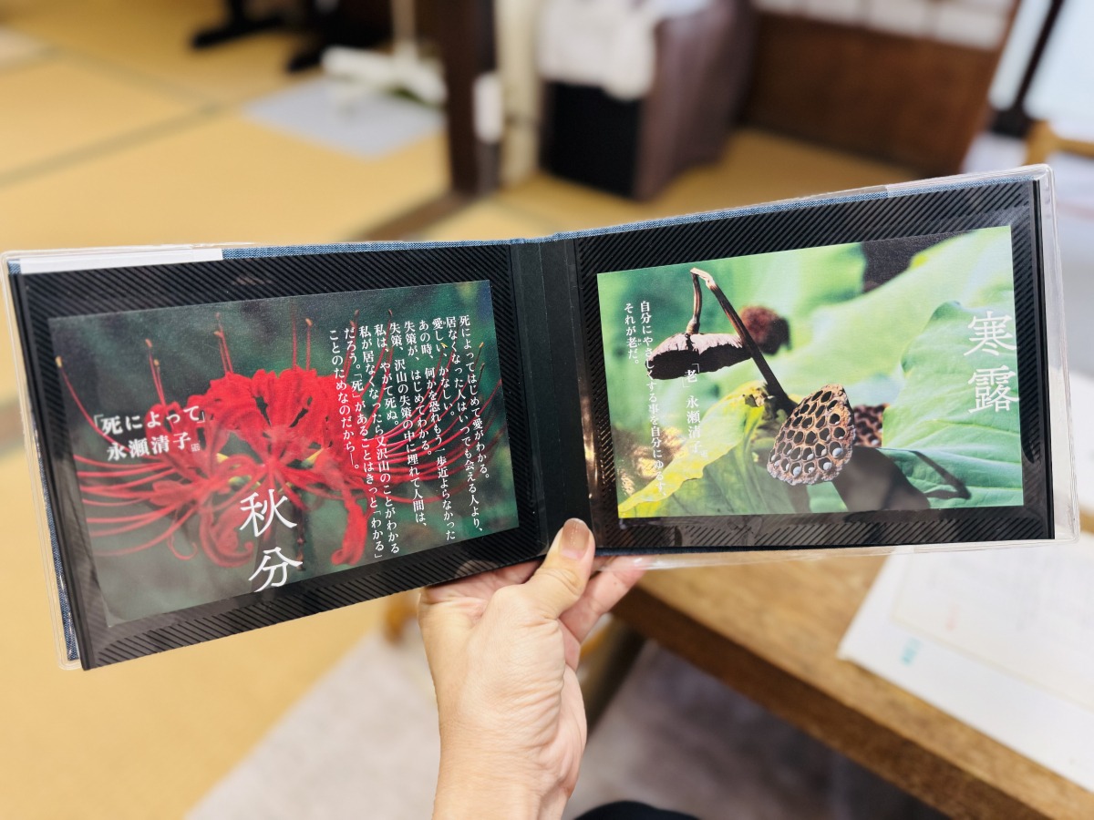 私が一番気に入ったのは、永瀬清子の二十四節気の絵葉書で、この絵葉書は数年前、宇野バスがお客様に季節の移ろいを感じていただけるよう、二十四節気を詩と写真とデザインで表現したポスターを作成し、運転席の後部に掲示していたものを絵葉書にしたもの。写真と詩のバランスがすごく綺麗で見入ってしまいました。