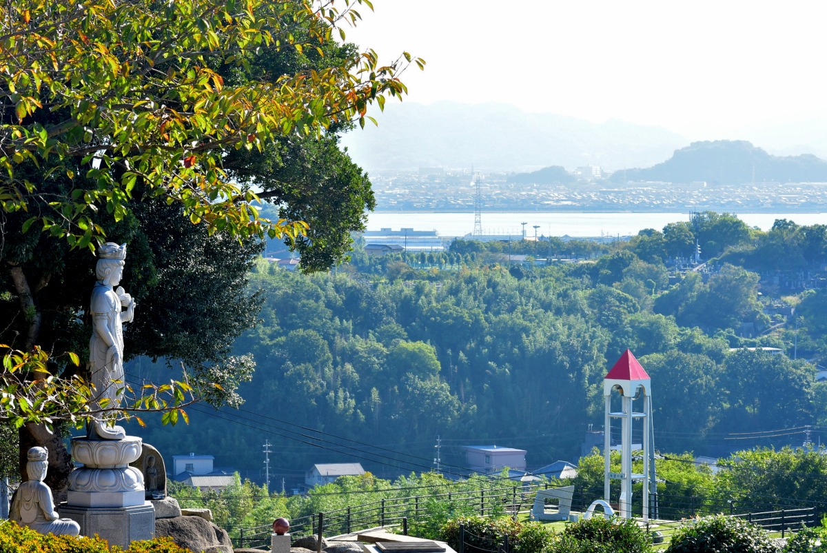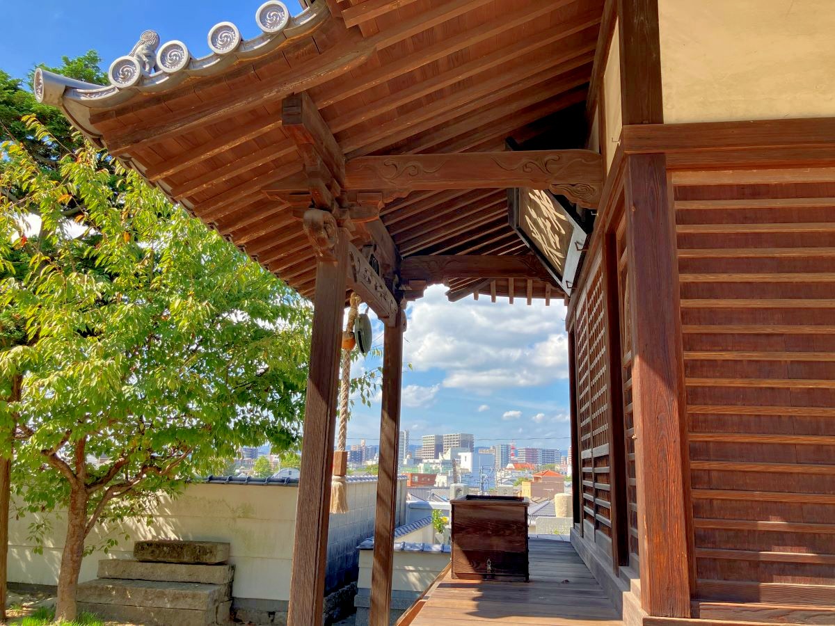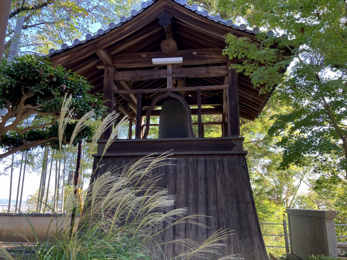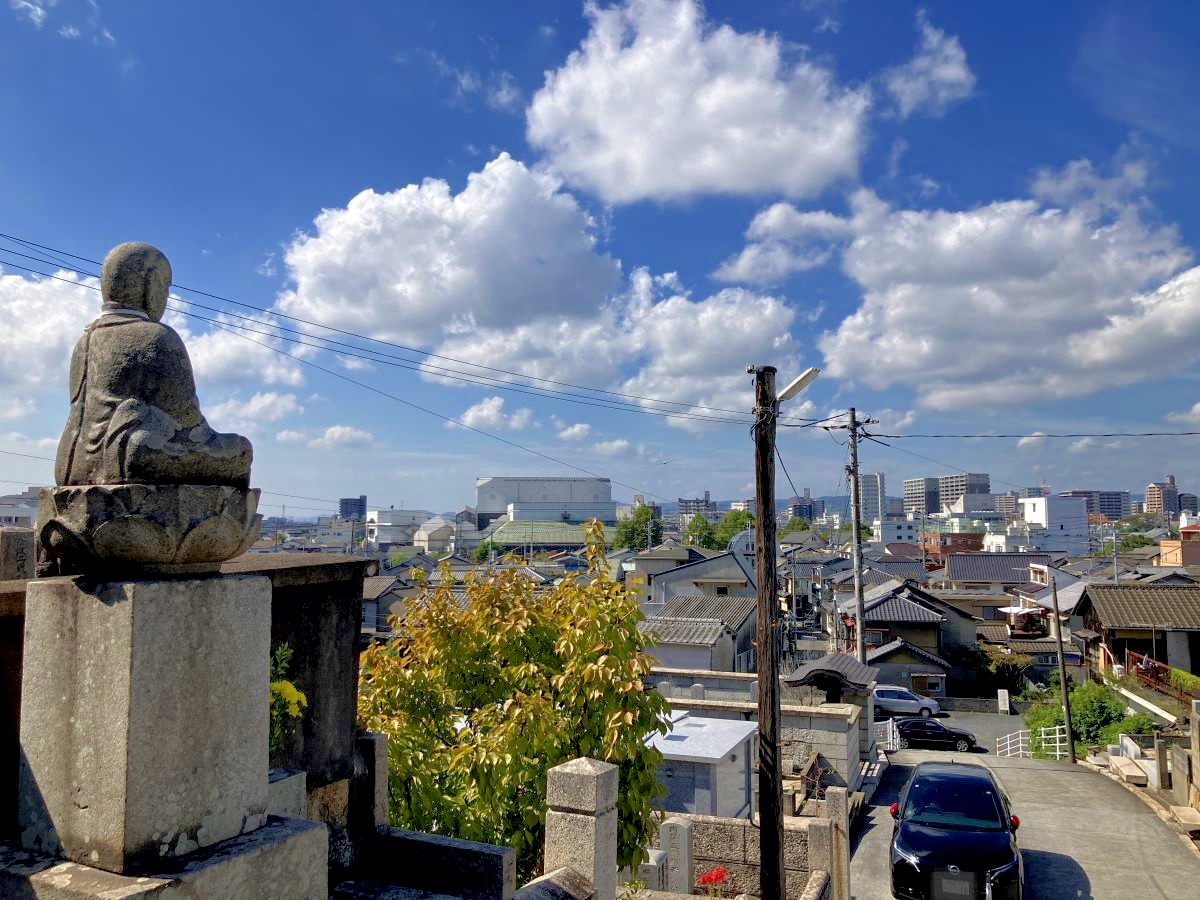 境内からも倉敷の町並みがのぞめました。大忍国仙のお墓。茅葺屋根の本堂。さすがは良寛さんもたびたび訪れたとされる古刹です。周辺には趣たっぷりの路地もあったりと、お寺のロケーションとあわせてたのしめますよ。