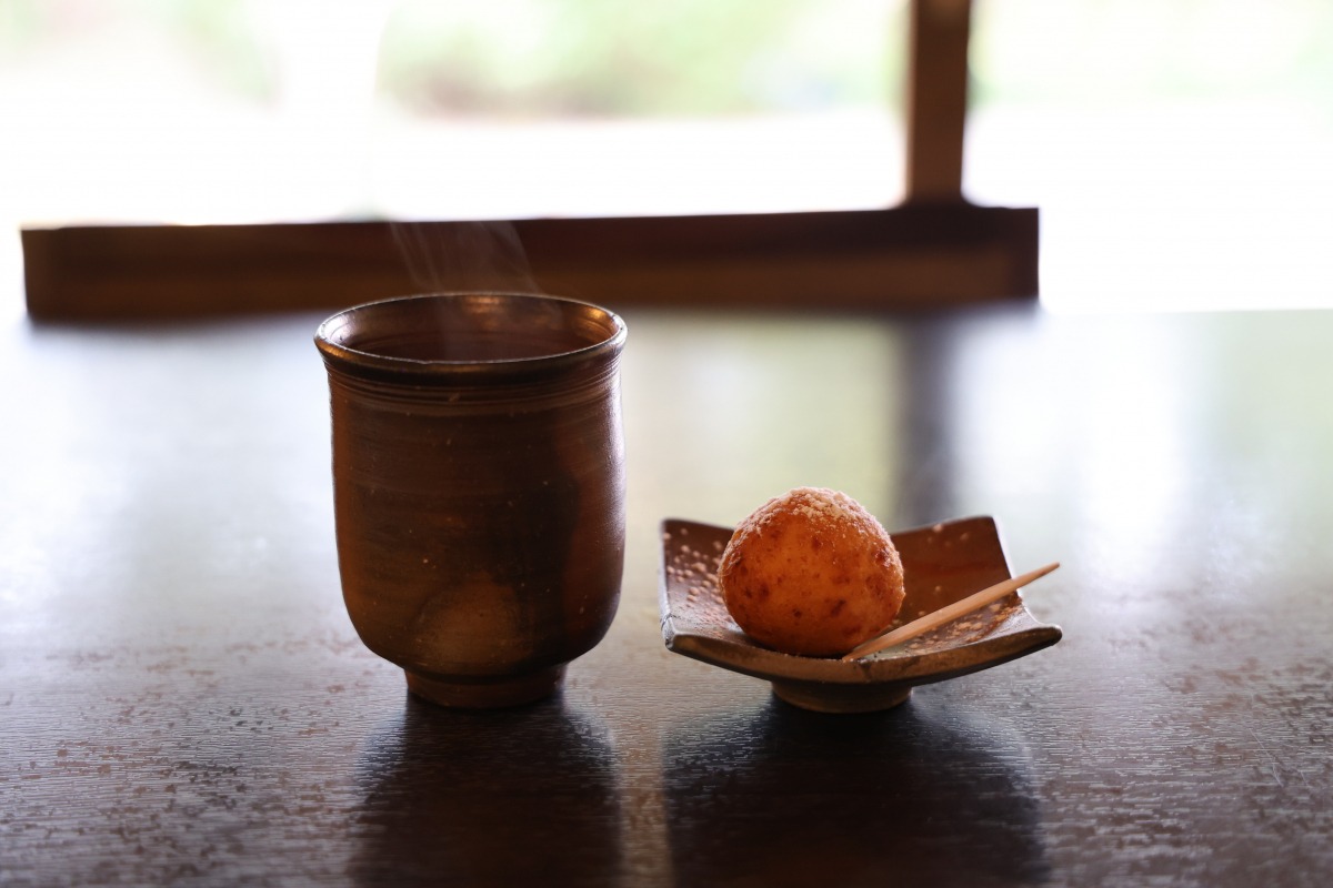 デザートには、TAKATUKIドーナツと黒豆茶か珈琲が付きます。もちもちしていて、程よい甘さです。備前焼で頂くお茶は、まろやかな感じがして味わい深かったです。紅葉を眺めながら、ゆっくりとしたランチ時間が過ごせるのでおすすめです。これからモミジの赤い色が増して、きっときれいだと思います。