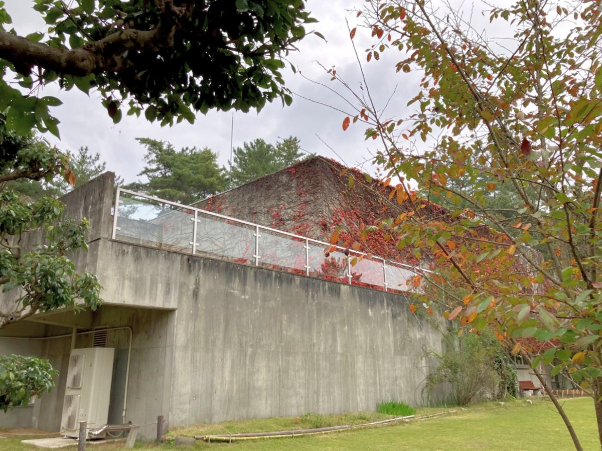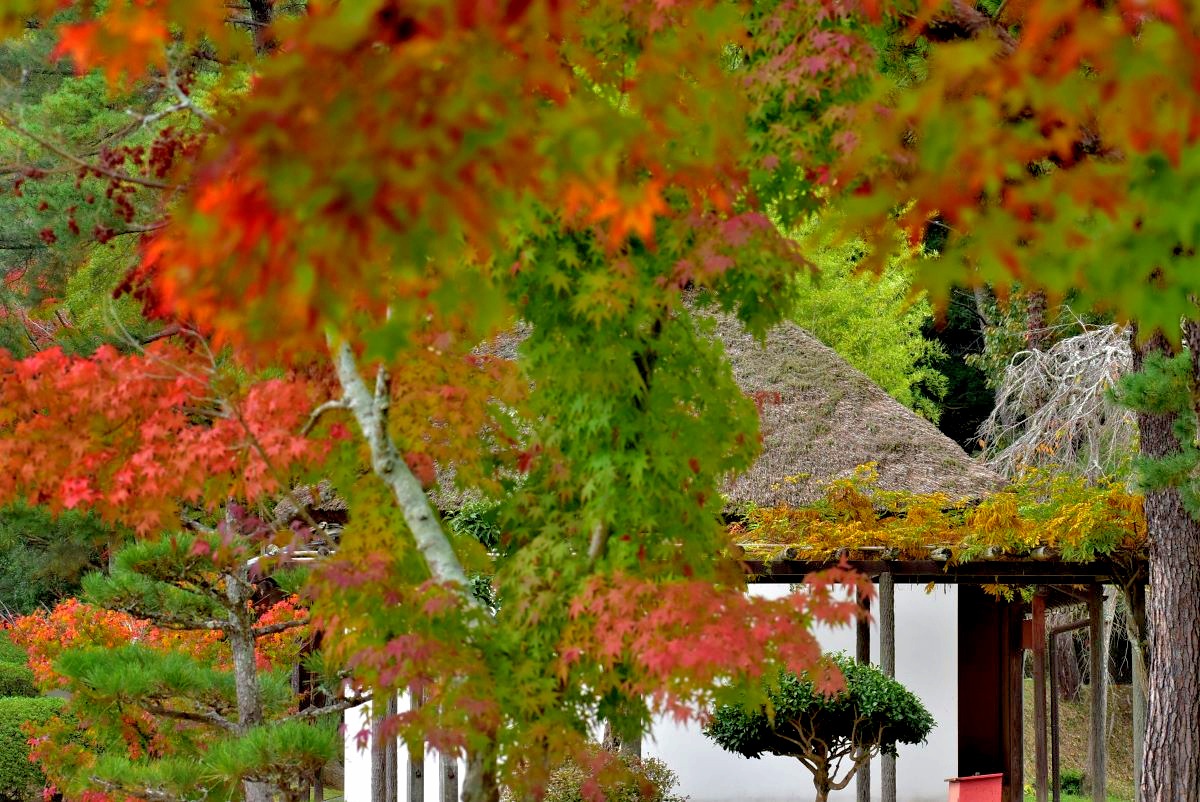 輝く紅葉に誘われるように階段をおりると、趣ある建物が2つ。地域の建築遺産として移築・保存され、しかも国登録有形文化財なんだとか。紅葉の美しさも相まって、しばしうっとり堪能してしまいました。旧山手村役場うらの池からの景色をたのしんだり。カラフルな鯉をながめるも良し。