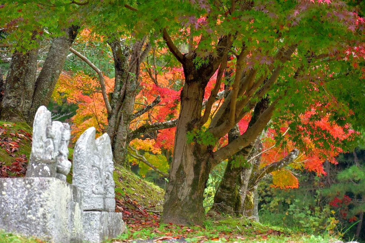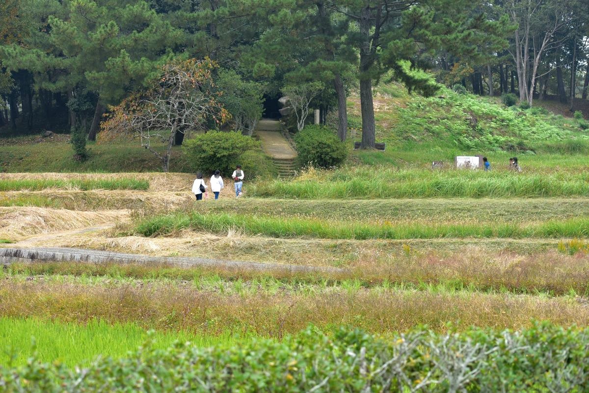 備中国分寺尼寺跡からお蕎麦屋さんの前をぬけて、五重塔へとラストスパートです。稲刈りのあと。焚火。なかよく並んだお地蔵さん。山里らしいながめがつづく中、ぞくぞくと人が吸い込まれていく「穴」がありました。これぞ有名なこうもり塚古墳です!丘陵景色に、横穴式石室。たのしく散策できること間違いなしです。
