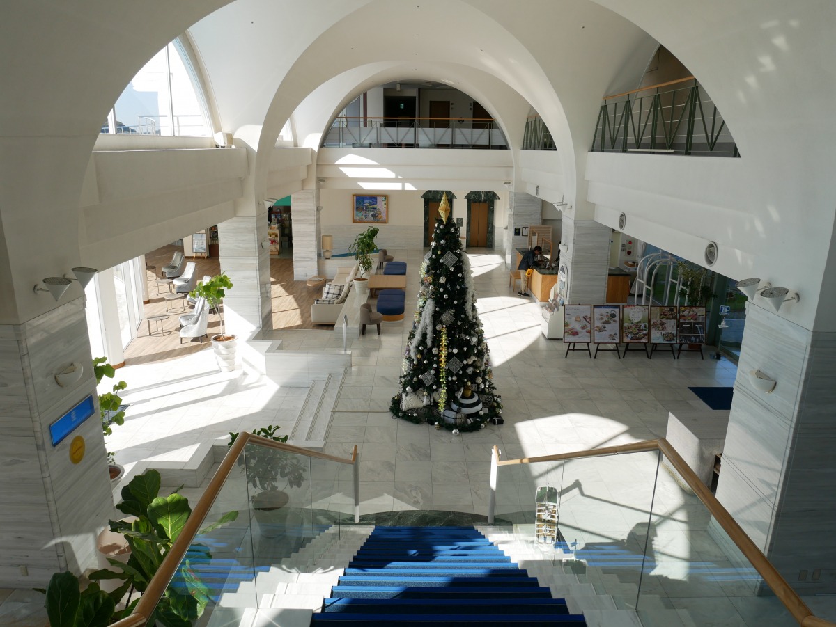 「まるで海外のリゾートホテルみたい!」。白と青を基調に統一された建物が、岡山の晴れた空によく映えますね。半円形のプールサイドは古代ギリシャの円形劇場のよう。