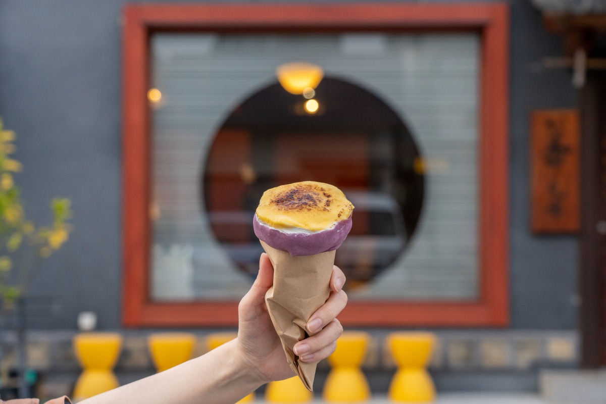 紫芋のペースト入り生地で芋あんとホイップクリームを巻いて、カスタードで覆った表面をキャラメリゼした、『さつまいもフェス【芋旅】in YAKAGE』限定メニューの「YAKI-IMO」(800円)。焼いもそっくりの見た目はSNS映え抜群です。もっちりとした生地に濃厚な芋あん、芳ばし甘いブリュレ風カスタードで大満足の食べ応え!